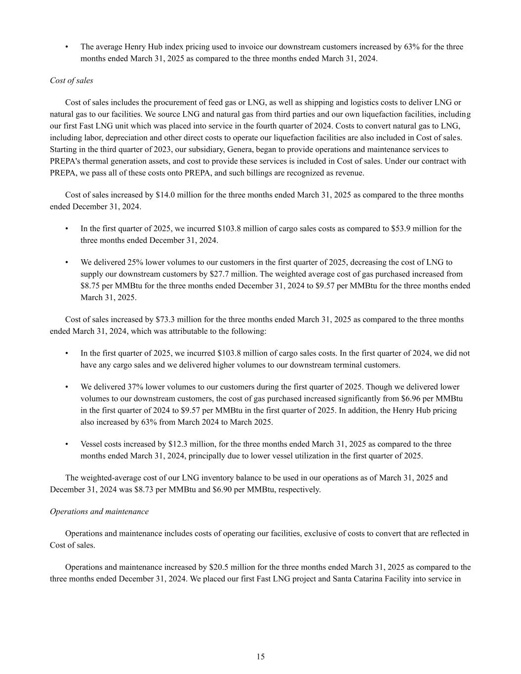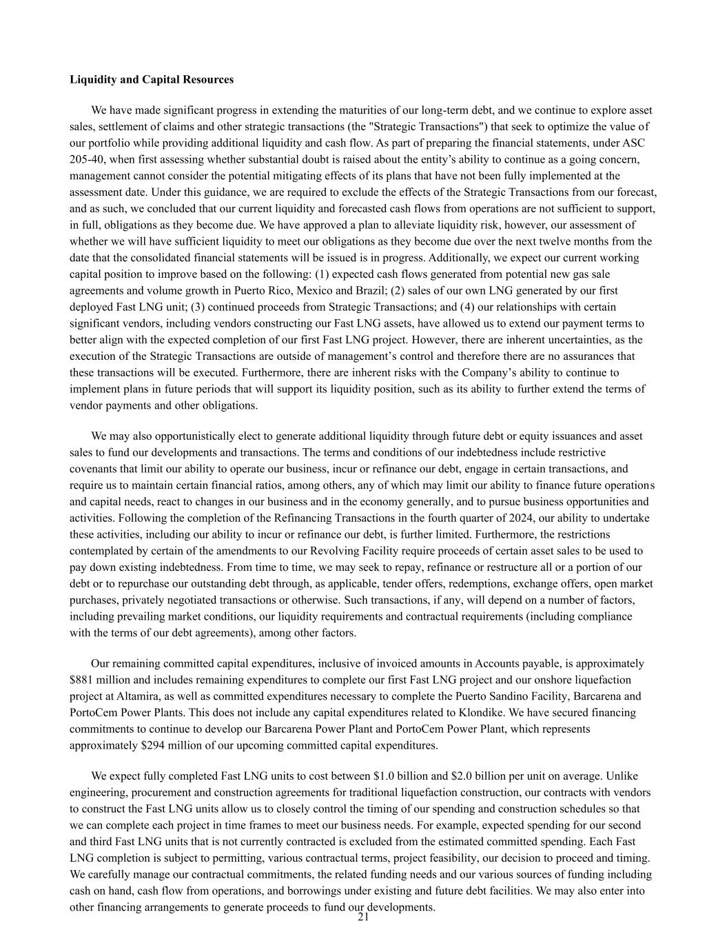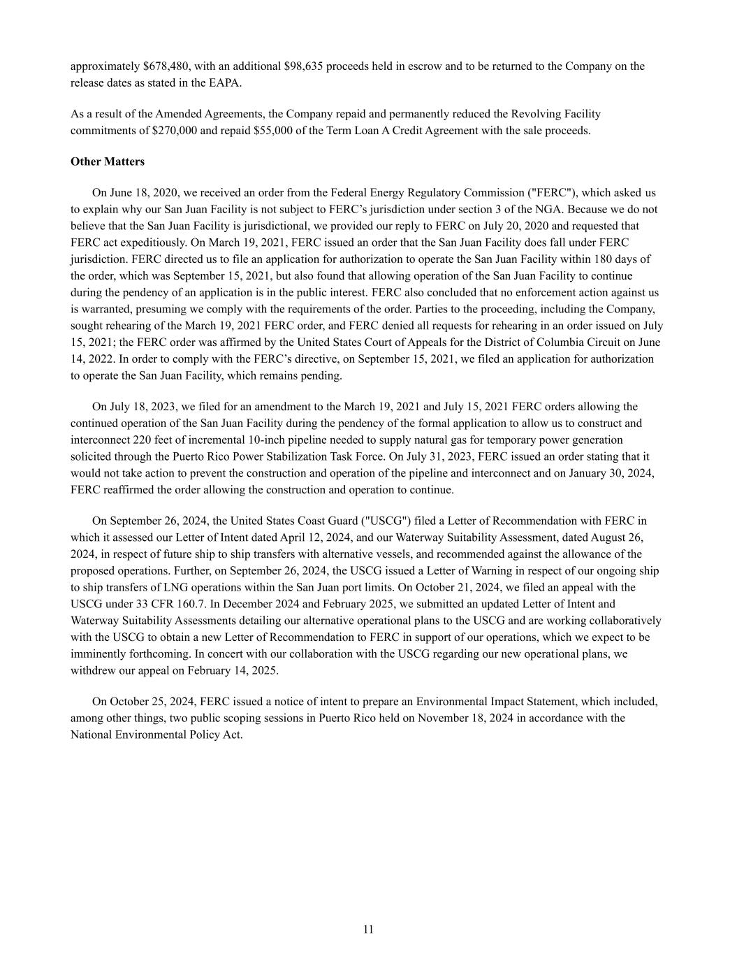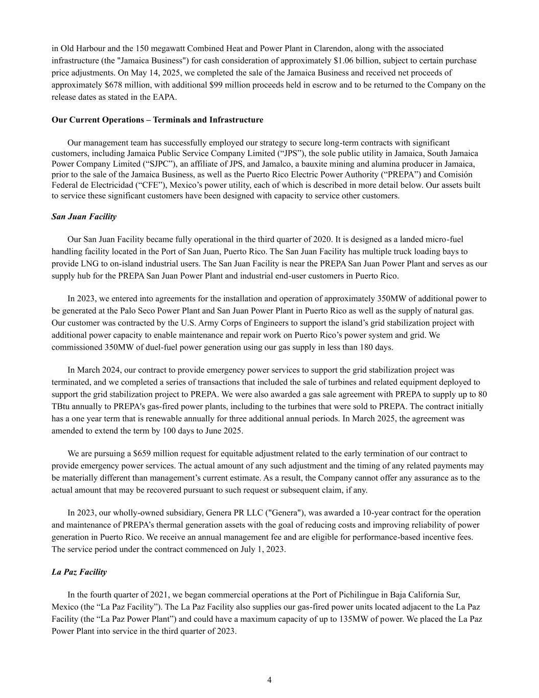 4 in Old Harbour and the 150 megawatt Combined Heat and Power Plant in Clarendon, along with the associated infrastructure (the "Jamaica Business") for cash consideration of approximately $1.06 billion, subject to certain purchase price adjustments. On May 14, 2025, we completed the sale of the Jamaica Business and received net proceeds of approximately $678 million, with additional $99 million proceeds held in escrow and to be returned to the Company on the release dates as stated in the EAPA. Our Current Operations – Terminals and Infrastructure Our management team has successfully employed our strategy to secure long-term contracts with significant customers, including Jamaica Public Service Company Limited (“JPS”), the sole public utility in Jamaica, South Jamaica Power Company Limited (“SJPC”), an affiliate of JPS, and Jamalco, a bauxite mining and alumina producer in Jamaica, prior to the sale of the Jamaica Business, as well as the Puerto Rico Electric Power Authority (“PREPA”) and Comisión Federal de Electricidad (“CFE”), Mexico’s power utility, each of which is described in more detail below. Our assets built to service these significant customers have been designed with capacity to service other customers. San Juan Facility Our San Juan Facility became fully operational in the third quarter of 2020. It is designed as a landed micro-fuel handling facility located in the Port of San Juan, Puerto Rico. The San Juan Facility has multiple truck loading bays to provide LNG to on-island industrial users. The San Juan Facility is near the PREPA San Juan Power Plant and serves as our supply hub for the PREPA San Juan Power Plant and industrial end-user customers in Puerto Rico. In 2023, we entered into agreements for the installation and operation of approximately 350MW of additional power to be generated at the Palo Seco Power Plant and San Juan Power Plant in Puerto Rico as well as the supply of natural gas. Our customer was contracted by the U.S. Army Corps of Engineers to support the island’s grid stabilization project with additional power capacity to enable maintenance and repair work on Puerto Rico’s power system and grid. We commissioned 350MW of duel-fuel power generation using our gas supply in less than 180 days. In March 2024, our contract to provide emergency power services to support the grid stabilization project was terminated, and we completed a series of transactions that included the sale of turbines and related equipment deployed to support the grid stabilization project to PREPA. We were also awarded a gas sale agreement with PREPA to supply up to 80 TBtu annually to PREPA's gas-fired power plants, including to the turbines that were sold to PREPA. The contract initially has a one year term that is renewable annually for three additional annual periods. In March 2025, the agreement was amended to extend the term by 100 days to June 2025. We are pursuing a $659 million request for equitable adjustment related to the early termination of our contract to provide emergency power services. The actual amount of any such adjustment and the timing of any related payments may be materially different than management’s current estimate. As a result, the Company cannot offer any assurance as to the actual amount that may be recovered pursuant to such request or subsequent claim, if any. In 2023, our wholly-owned subsidiary, Genera PR LLC ("Genera"), was awarded a 10-year contract for the operation and maintenance of PREPA’s thermal generation assets with the goal of reducing costs and improving reliability of power generation in Puerto Rico. We receive an annual management fee and are eligible for performance-based incentive fees. The service period under the contract commenced on July 1, 2023. La Paz Facility In the fourth quarter of 2021, we began commercial operations at the Port of Pichilingue in Baja California Sur, Mexico (the “La Paz Facility”). The La Paz Facility also supplies our gas-fired power units located adjacent to the La Paz Facility (the “La Paz Power Plant”) and could have a maximum capacity of up to 135MW of power. We placed the La Paz Power Plant into service in the third quarter of 2023.