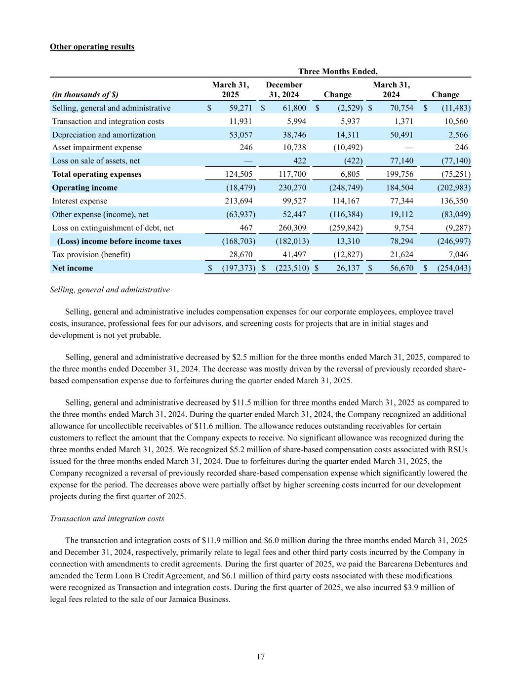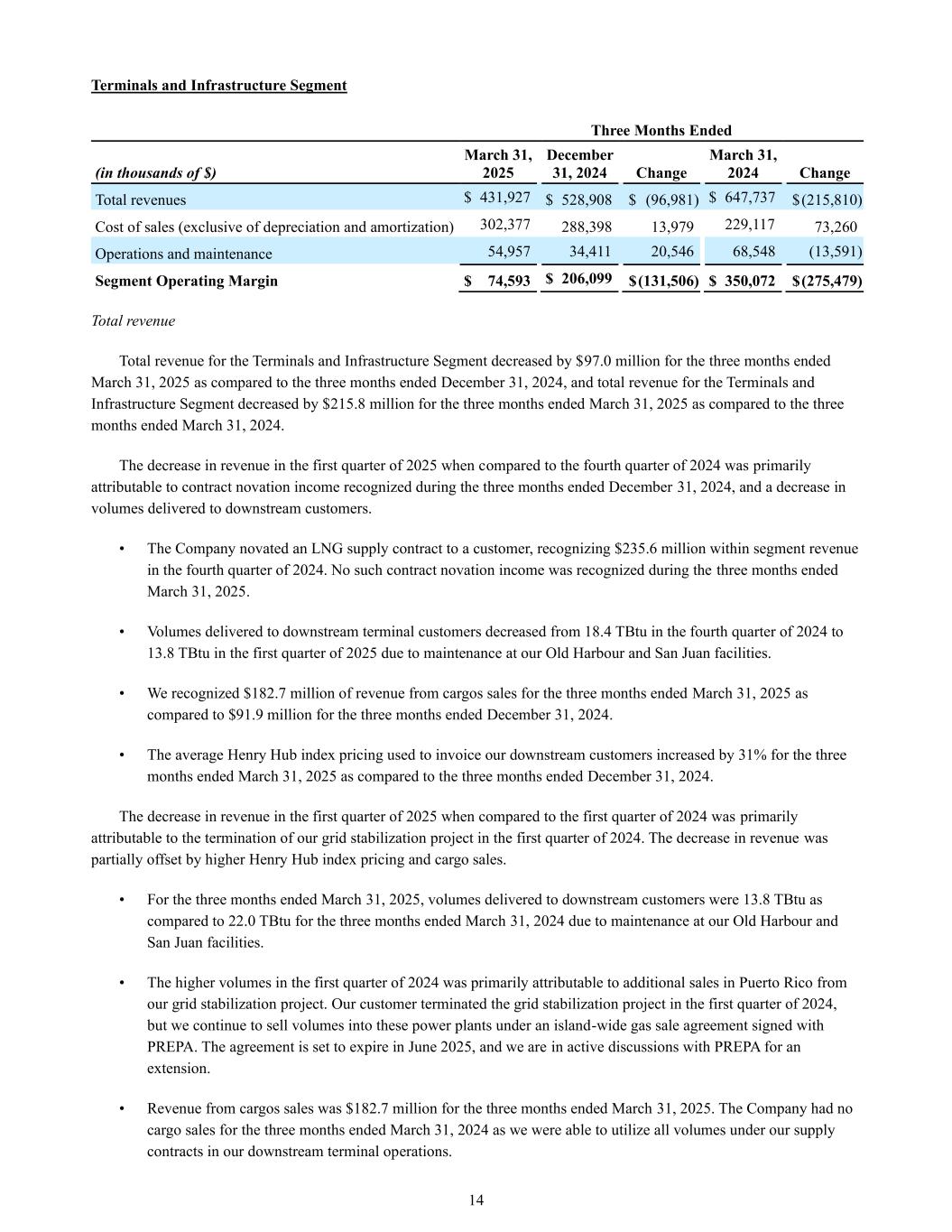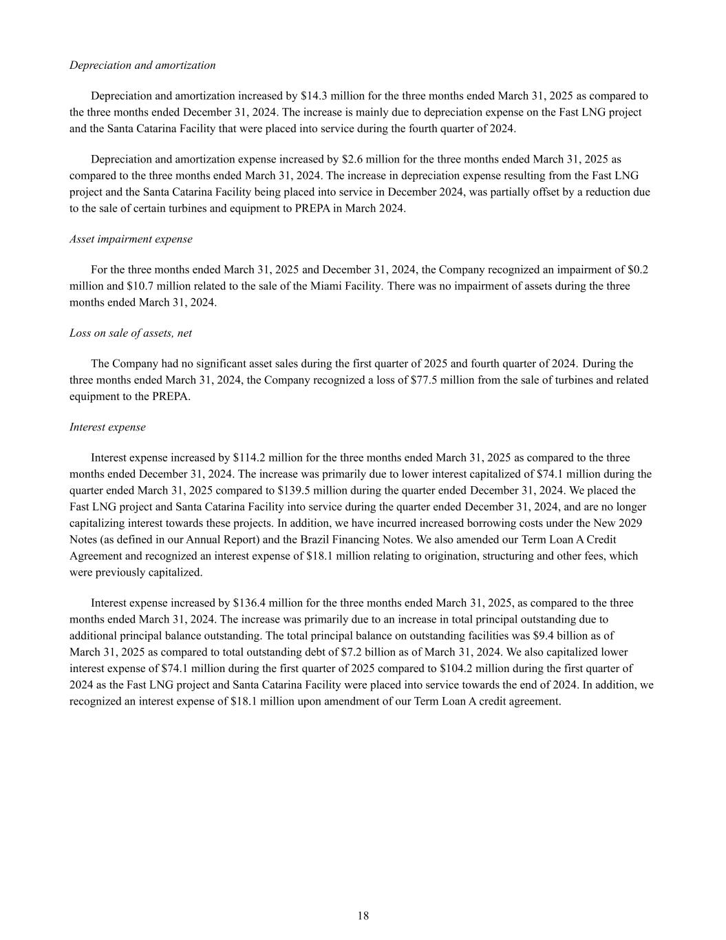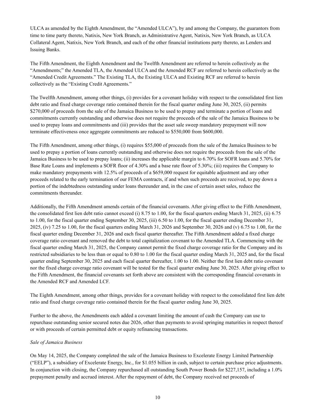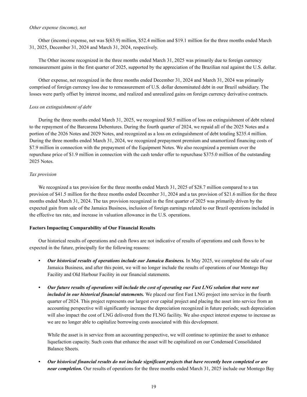 4 in Old Harbour and the 150 megawatt Combined Heat and Power Plant in Clarendon, along with the associated infrastructure (the "Jamaica Business") for cash consideration of approximately $1.06 billion, subject to certain purchase price adjustments. On May 14, 2025, we completed the sale of the Jamaica Business and received net proceeds of approximately $678 million, with additional $99 million proceeds held in escrow and to be returned to the Company on the release dates as stated in the EAPA. Our Current Operations – Terminals and Infrastructure Our management team has successfully employed our strategy to secure long-term contracts with significant customers, including Jamaica Public Service Company Limited (“JPS”), the sole public utility in Jamaica, South Jamaica Power Company Limited (“SJPC”), an affiliate of JPS, and Jamalco, a bauxite mining and alumina producer in Jamaica, prior to the sale of the Jamaica Business, as well as the Puerto Rico Electric Power Authority (“PREPA”) and Comisión Federal de Electricidad (“CFE”), Mexico’s power utility, each of which is described in more detail below. Our assets built to service these significant customers have been designed with capacity to service other customers. San Juan Facility Our San Juan Facility became fully operational in the third quarter of 2020. It is designed as a landed micro-fuel handling facility located in the Port of San Juan, Puerto Rico. The San Juan Facility has multiple truck loading bays to provide LNG to on-island industrial users. The San Juan Facility is near the PREPA San Juan Power Plant and serves as our supply hub for the PREPA San Juan Power Plant and industrial end-user customers in Puerto Rico. In 2023, we entered into agreements for the installation and operation of approximately 350MW of additional power to be generated at the Palo Seco Power Plant and San Juan Power Plant in Puerto Rico as well as the supply of natural gas. Our customer was contracted by the U.S. Army Corps of Engineers to support the island’s grid stabilization project with additional power capacity to enable maintenance and repair work on Puerto Rico’s power system and grid. We commissioned 350MW of duel-fuel power generation using our gas supply in less than 180 days. In March 2024, our contract to provide emergency power services to support the grid stabilization project was terminated, and we completed a series of transactions that included the sale of turbines and related equipment deployed to support the grid stabilization project to PREPA. We were also awarded a gas sale agreement with PREPA to supply up to 80 TBtu annually to PREPA's gas-fired power plants, including to the turbines that were sold to PREPA. The contract initially has a one year term that is renewable annually for three additional annual periods. In March 2025, the agreement was amended to extend the term by 100 days to June 2025. We are pursuing a $659 million request for equitable adjustment related to the early termination of our contract to provide emergency power services. The actual amount of any such adjustment and the timing of any related payments may be materially different than management’s current estimate. As a result, the Company cannot offer any assurance as to the actual amount that may be recovered pursuant to such request or subsequent claim, if any. In 2023, our wholly-owned subsidiary, Genera PR LLC ("Genera"), was awarded a 10-year contract for the operation and maintenance of PREPA’s thermal generation assets with the goal of reducing costs and improving reliability of power generation in Puerto Rico. We receive an annual management fee and are eligible for performance-based incentive fees. The service period under the contract commenced on July 1, 2023. La Paz Facility In the fourth quarter of 2021, we began commercial operations at the Port of Pichilingue in Baja California Sur, Mexico (the “La Paz Facility”). The La Paz Facility also supplies our gas-fired power units located adjacent to the La Paz Facility (the “La Paz Power Plant”) and could have a maximum capacity of up to 135MW of power. We placed the La Paz Power Plant into service in the third quarter of 2023.