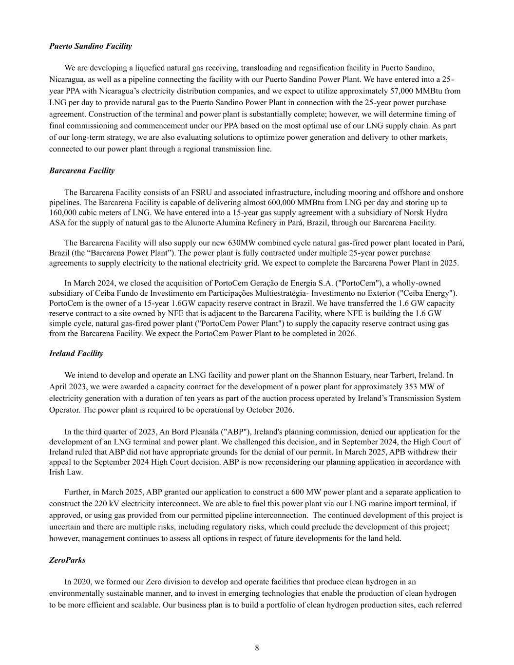 8 Puerto Sandino Facility We are developing a liquefied natural gas receiving, transloading and regasification facility in Puerto Sandino, Nicaragua, as well as a pipeline connecting the facility with our Puerto Sandino Power Plant. We have entered into a 25- year PPA with Nicaragua’s electricity distribution companies, and we expect to utilize approximately 57,000 MMBtu from LNG per day to provide natural gas to the Puerto Sandino Power Plant in connection with the 25-year power purchase agreement. Construction of the terminal and power plant is substantially complete; however, we will determine timing of final commissioning and commencement under our PPA based on the most optimal use of our LNG supply chain. As part of our long-term strategy, we are also evaluating solutions to optimize power generation and delivery to other markets, connected to our power plant through a regional transmission line. Barcarena Facility The Barcarena Facility consists of an FSRU and associated infrastructure, including mooring and offshore and onshore pipelines. The Barcarena Facility is capable of delivering almost 600,000 MMBtu from LNG per day and storing up to 160,000 cubic meters of LNG. We have entered into a 15-year gas supply agreement with a subsidiary of Norsk Hydro ASA for the supply of natural gas to the Alunorte Alumina Refinery in Pará, Brazil, through our Barcarena Facility. The Barcarena Facility will also supply our new 630MW combined cycle natural gas-fired power plant located in Pará, Brazil (the “Barcarena Power Plant”). The power plant is fully contracted under multiple 25-year power purchase agreements to supply electricity to the national electricity grid. We expect to complete the Barcarena Power Plant in 2025. In March 2024, we closed the acquisition of PortoCem Geração de Energia S.A. ("PortoCem"), a wholly-owned subsidiary of Ceiba Fundo de Investimento em Participações Multiestratégia- Investimento no Exterior ("Ceiba Energy"). PortoCem is the owner of a 15-year 1.6GW capacity reserve contract in Brazil. We have transferred the 1.6 GW capacity reserve contract to a site owned by NFE that is adjacent to the Barcarena Facility, where NFE is building the 1.6 GW simple cycle, natural gas-fired power plant ("PortoCem Power Plant") to supply the capacity reserve contract using gas from the Barcarena Facility. We expect the PortoCem Power Plant to be completed in 2026. Ireland Facility We intend to develop and operate an LNG facility and power plant on the Shannon Estuary, near Tarbert, Ireland. In April 2023, we were awarded a capacity contract for the development of a power plant for approximately 353 MW of electricity generation with a duration of ten years as part of the auction process operated by Ireland’s Transmission System Operator. The power plant is required to be operational by October 2026. In the third quarter of 2023, An Bord Pleanála ("ABP"), Ireland's planning commission, denied our application for the development of an LNG terminal and power plant. We challenged this decision, and in September 2024, the High Court of Ireland ruled that ABP did not have appropriate grounds for the denial of our permit. In March 2025, APB withdrew their appeal to the September 2024 High Court decision. ABP is now reconsidering our planning application in accordance with Irish Law. Further, in March 2025, ABP granted our application to construct a 600 MW power plant and a separate application to construct the 220 kV electricity interconnect. We are able to fuel this power plant via our LNG marine import terminal, if approved, or using gas provided from our permitted pipeline interconnection. The continued development of this project is uncertain and there are multiple risks, including regulatory risks, which could preclude the development of this project; however, management continues to assess all options in respect of future developments for the land held. ZeroParks In 2020, we formed our Zero division to develop and operate facilities that produce clean hydrogen in an environmentally sustainable manner, and to invest in emerging technologies that enable the production of clean hydrogen to be more efficient and scalable. Our business plan is to build a portfolio of clean hydrogen production sites, each referred