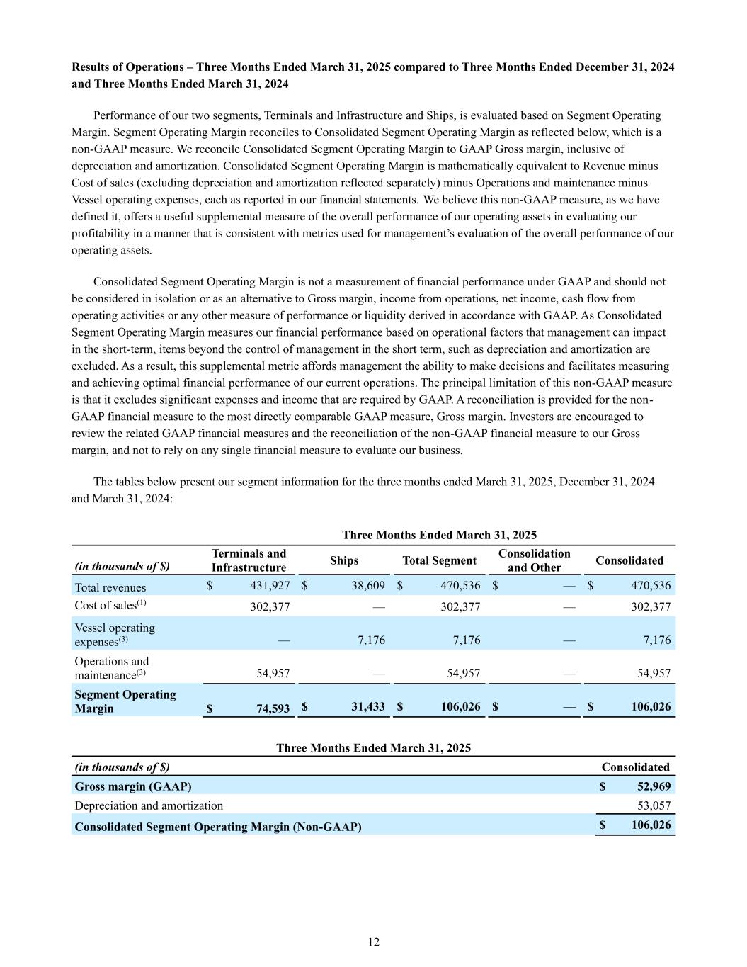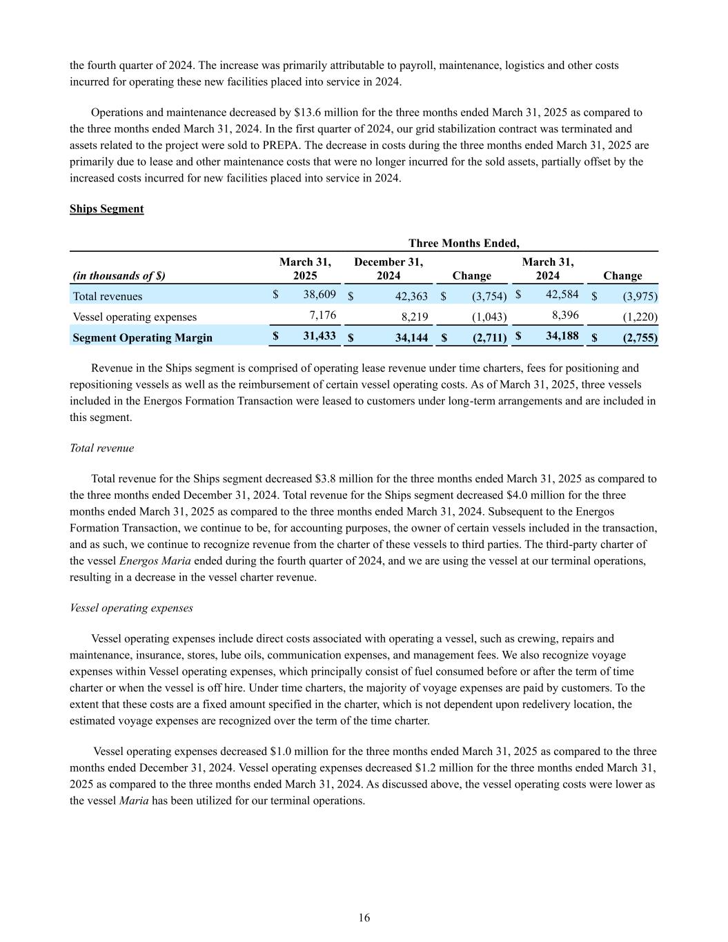 3 Certain information contained in the following discussion and analysis, including information with respect to our plans, strategy, projections and expected timeline for our business and related financing, includes forward-looking statements. Forward-looking statements are estimates based upon current information and involve a number of risks and uncertainties. Actual events or results may differ materially from the results anticipated in these forward-looking statements as a result of a variety of factors. You should read “Risk Factors” and “Cautionary Statement on Forward-Looking Statements” in the Annual Report on Form 10-K for the year ended December 31, 2024 (our “Annual Report”) for a discussion of important factors that could cause actual results to differ materially from the results described in or implied by the forward-looking statements contained in the following discussion and analysis. This information is intended to provide investors with an understanding of our past performance and our current financial condition and is not necessarily indicative of our future performance. Please refer to “—Factors Impacting Comparability of Our Financial Results” for further discussion. Unless otherwise indicated, dollar amounts are presented in millions. Unless the context otherwise requires, references to “Company,” “NFE,” “we,” “our,” “us” or like terms refer to New Fortress Energy Inc. and its subsidiaries. Overview We are a global energy infrastructure company founded to help address energy poverty and accelerate the world’s transition to reliable, affordable and clean energy. We own and operate natural gas and liquefied natural gas ("LNG") infrastructure, and an integrated fleet of ships and logistics assets to rapidly deliver turnkey energy solutions to global markets; additionally, we have expanded our focus to building our modular LNG manufacturing business. Our near-term mission is to provide modern infrastructure solutions to create cleaner, reliable energy while generating a positive economic impact worldwide. Our long-term mission is to become one of the world’s leading companies providing power free from carbon emissions by leveraging our global portfolio of integrated energy infrastructure. We discuss this important goal in more detail in our Annual Report, “Items 1 and 2: Business and Properties” under “Sustainability—Toward a Low Carbon Future.” Our chief operating decision maker makes resource allocation decisions and assesses performance on the basis of two operating segments, Terminals and Infrastructure and Ships. Our Terminals and Infrastructure segment includes the entire production and delivery chain from natural gas procurement and liquefaction to logistics, shipping, facilities and conversion or development of natural gas-fired power generation. We currently source LNG from long-term supply agreements with third-party suppliers. We placed our first floating liquefaction unit, which we refer to as "Fast LNG" or "FLNG", into service in the fourth quarter of 2024, and we plan to source a portion of our LNG needs from this facility. The Terminals and Infrastructure segment includes all terminal operations in Jamaica (prior to the sale of our Jamaica Business (as defined below)), Puerto Rico, Mexico and Brazil, as well as vessels utilized in our terminal or logistics operations. We centrally manage our LNG supply and the deployment of our vessels utilized in our terminal, logistics or sub-charter operations, which allows us to optimally manage our LNG supply and fleet. Our Ships segment includes certain vessels which are currently chartered under long-term arrangements to third parties and are part of the Energos Formation Transaction (defined below). Over time, we expect to utilize these vessels in our own terminal operations as charter agreements for these vessels expire, and these vessels are expected to be included in our Terminals and Infrastructure segment at such time. In March 2025, we entered into an equity and asset purchase agreement (the "EAPA") to sell our Jamaica business, including operations at the LNG import terminal in Montego Bay, the offshore floating storage and regasification terminal