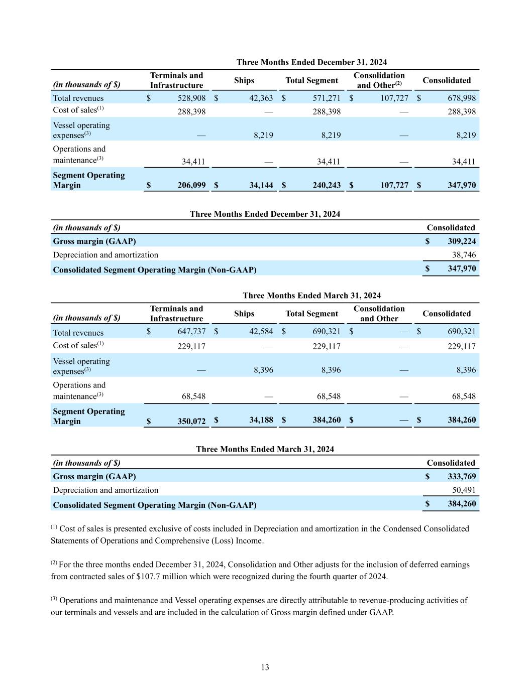 1 New Fortress Energy Inc. Condensed Consolidated Statements of Cash Flows For the three months ended March 31, 2025 and 2024 (Unaudited, in thousands of U.S. dollars) Three Months Ended March 31, 2025 2024 Cash flows from operating activities Net (loss) income $ (197,373) $ 56,670 Adjustments for: Depreciation and amortization 63,353 50,491 Deferred taxes (4,740) (6,822) Loss on asset sales — 77,140 (Earnings) recognized from vessels chartered to third parties transferred to Energos (13,082) (23,952) Loss on the disposal of equity method investment — 7,222 Other (6,635) 39,287 Changes in operating assets and liabilities: (Increase) in receivables (7,001) (8,656) Decrease (increase) in inventories 7,622 (85,539) (Increase) in other assets (1,074) (19,394) Decrease in right-of-use assets 30,848 57,190 Increase in accounts payable/accrued liabilities 130,433 63,208 (Decrease) in amounts due to affiliates (6,780) (3,479) (Decrease) in lease liabilities (42,888) (62,090) Increase (decrease) in other liabilities 15,612 (71,226) Net cash (used in) provided by operating activities (31,705) 70,050 Cash flows from investing activities Capital expenditures (340,470) (683,449) Sale of equity method investment — 136,365 Asset sales — 328,999 Other investing activities 4,555 (1,695) Net cash used in investing activities (335,915) (219,780) Cash flows from financing activities Proceeds from borrowings of debt 901,733 2,164,687 Payment of deferred financing costs (26,093) (25,781) Repayment of debt (664,062) (1,944,044) Payment of dividends (3,460) (32,326) Other financing activities (3,662) (4,919) Net cash provided by financing activities 204,456 157,617 Impact of changes in foreign exchange rates on cash and cash equivalents 34,332 (3,768) Net (decrease) increase in cash, cash equivalents and restricted cash (128,832) 4,119 Cash, cash equivalents and restricted cash – beginning of period 965,577 310,814 Cash, cash equivalents and restricted cash – end of period $ 836,745 $ 314,933 Supplemental disclosure of non-cash investing and financing activities: Changes in accounts payable and accrued liabilities associated with construction in progress and property, plant and equipment additions $ (62,874) $ (117,304) Accounts payable and accrued liabilities associated with construction in progress and property, plant and equipment additions 366,358 623,318 Principal payments on financing obligation to Energos by third party charters (9,871) (2,912) Class A convertible preferred stock issued and debt assumed in the PortoCem Acquisition — (125,198)