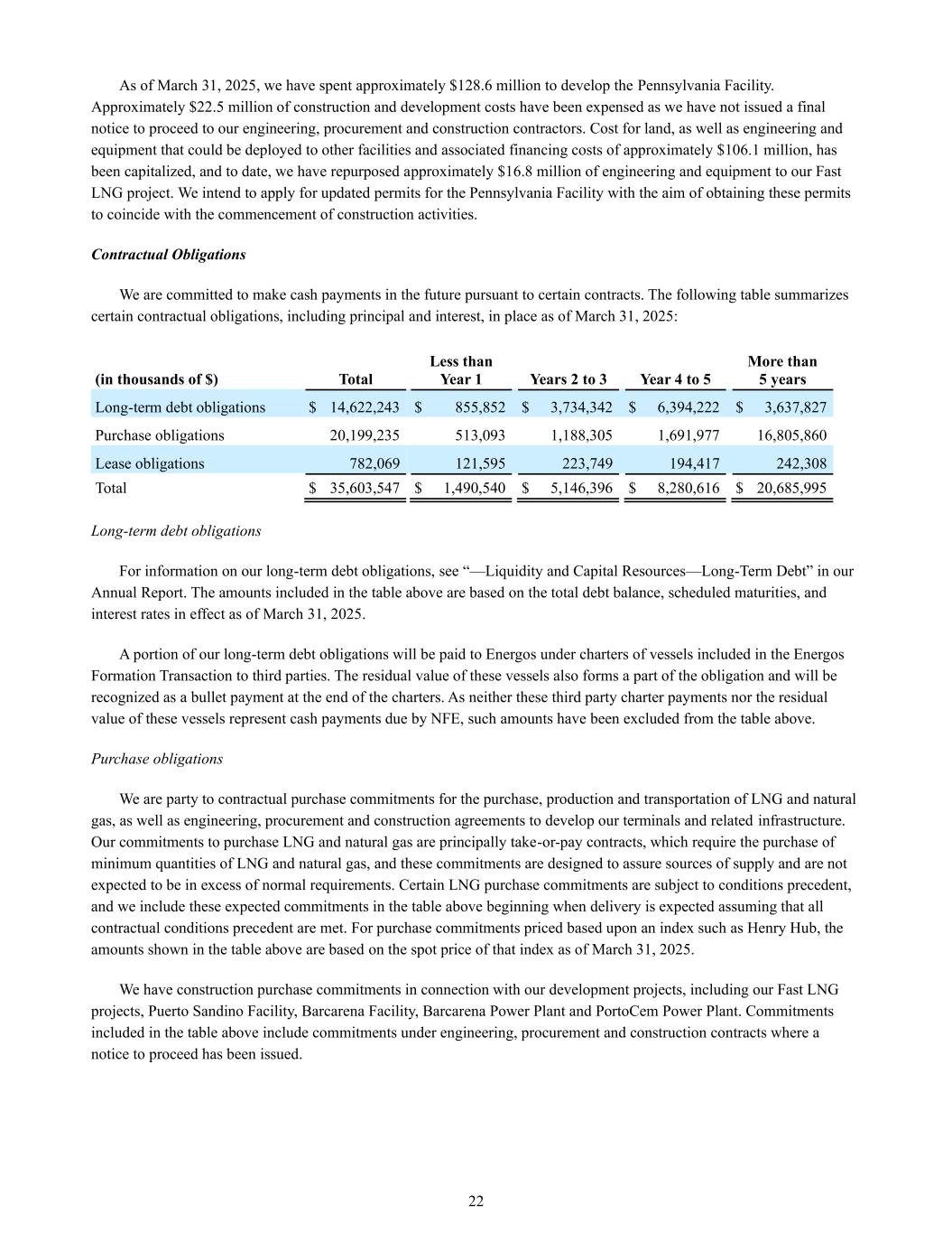 5 In the fourth quarter of 2022, we finalized short-form agreements with CFE to expand and extend our supply of natural gas to multiple CFE power generation facilities in Baja California Sur and to sell the La Paz Power Plant to CFE. In the third quarter of 2024, we executed a 10-year gas sales agreement to supply natural gas to additional CFE facilities on take- or-pay basis. Santa Catarina Facility We placed our Santa Catarina Facility in service in the fourth quarter of 2024. The Santa Catarina Facility is located on the southern coast of Brazil and consists of an FSRU with a processing capacity of approximately 500,000 MMBtu from LNG per day and LNG storage capacity of up to 138,000 cubic meters. We have developed and constructed a 33-kilometer, 20-inch pipeline that connects the Santa Catarina Facility to the existing inland Transportadora Brasileira Gasoduto Bolivia-Brasil S.A. (“TBG”) pipeline via an interconnection point in the municipality of Garuva. The Santa Catarina Facility and associated pipeline are expected to have a total addressable market of 15 million cubic meters per day of natural gas. In August 2024, we acquired 100% of the outstanding equity interest of Usina Termeletrica de Lins S.A. ("Lins"), which owns key rights and permits to develop a natural gas-fired power plant for up to 2.05GW located in the State of Sao Paulo, within the city limits of Lins. We expect to participate in the power auctions anticipated to occur in 2025 in Brazil, and to the extent that NFE is successful in these auctions, we plan to develop a gas-fired power plant using natural gas from the Santa Catarina Facility. Montego Bay Facility The Montego Bay Facility serves as our supply hub for the north side of Jamaica, providing natural gas to JPS to fuel the 145MW Bogue power plant in Montego Bay, Jamaica ("Bogue Power Plant"). Our Montego Bay Facility commenced commercial operations in October 2016 and is capable of processing up to 60,000 MMBtu of LNG per day and features approximately 7,000 cubic meters of onsite storage. The Montego Bay Facility also consists of an ISO loading facility that can transport LNG to numerous on-island industrial users. We no longer own the Montego Bay Facility after we completed the sale of the Jamaica Business, and starting in the second quarter of 2025, we will no longer reflect the results of operations from the Montego Bay Facility in our financial statements. Old Harbour Facility The Old Harbour Facility is an offshore facility consisting of an FSRU that is capable of processing up to 750,000 MMBtus of LNG per day. The Old Harbour Facility commenced commercial operations in June 2019 and supplies natural gas to the 190MW Old Harbour power plant (“Old Harbour Power Plant”) operated by SJPC. The Old Harbour Facility is also supplying natural gas to our dual-fired combined heat and power facility in Clarendon, Jamaica (“CHP Plant”). The CHP Plant supplies electricity to JPS under a long-term agreement. The CHP Plant also provides steam to Jamalco under a long-term take-or-pay agreement. The Old Harbour Facility also supplies gas directly to Jamalco to utilize in their gas-fired boilers. We no longer own the Old Harbour Facility and CHP Plant after we completed the sale of the Jamaica Business, and starting in the second quarter of 2025, we will no longer reflect the results of operations from the Old Harbour Facility and CHP Plant in our financial statements. Our LNG Supply and Cargo Sales NFE provides reliable, affordable and clean energy supplies to customers around the world that we plan to satisfy through the following sources: 1) our current contractual supply commitments; 2) our own FLNG production; and 3) additional LNG supply contracts expected to commence in 2027. Our first FLNG facility began to produce LNG in July