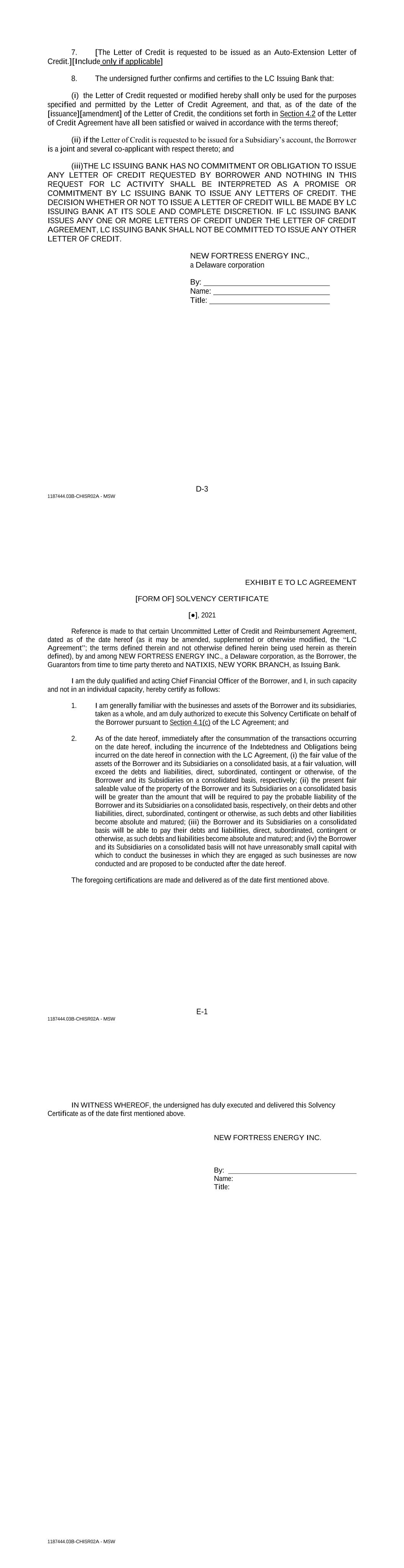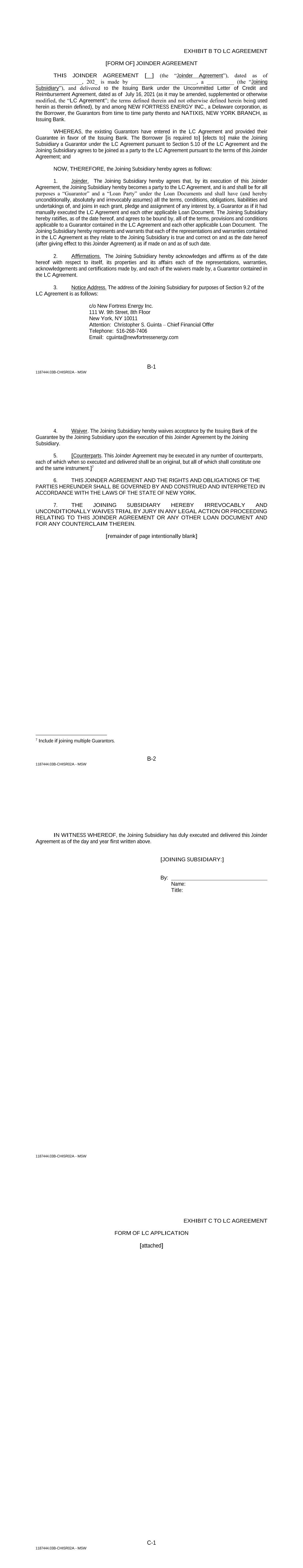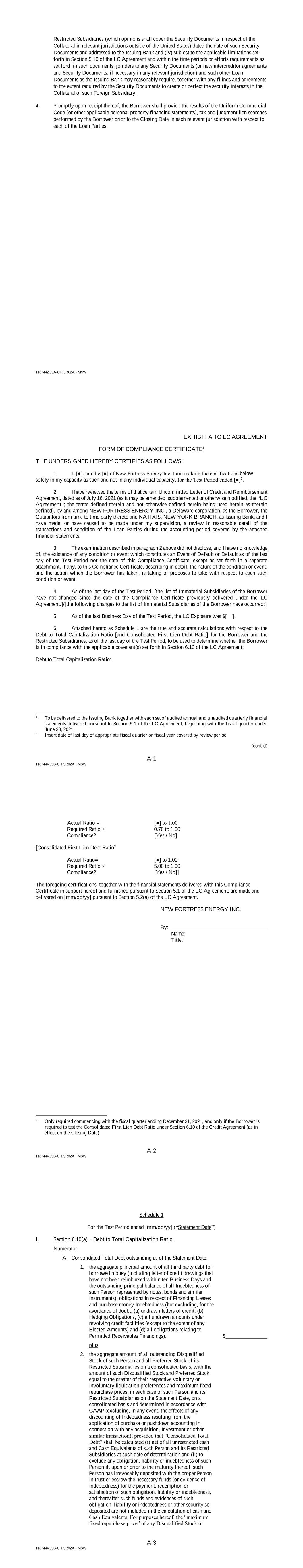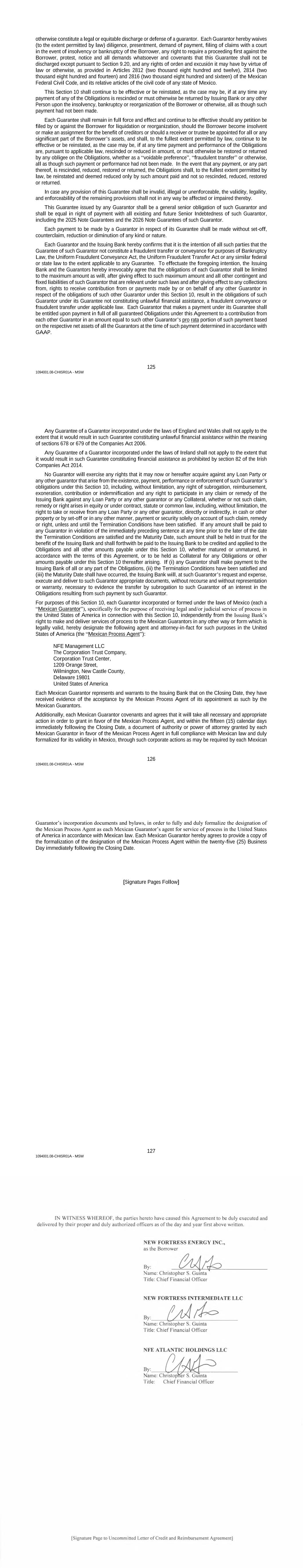 This FOURTH AMENDMENT TO CREDIT AGREEMENT (this “Amendment”), dated as of March 3, 2025, is among NEW FORTRESS ENERGY INC., a Delaware corporation (the “Borrower”), each of the undersigned guarantors (the “Guarantors”), the Lenders party hereto and MORGAN STANLEY SENIOR FUNDING, INC., as administrative agent for the Lenders (in such capacity, together with its successors and assigns in such capacity, the “Administrative Agent”) and as collateral agent for the Secured Parties (in such capacity, together with its successors and assigns in such capacity, the “Collateral Agent”).