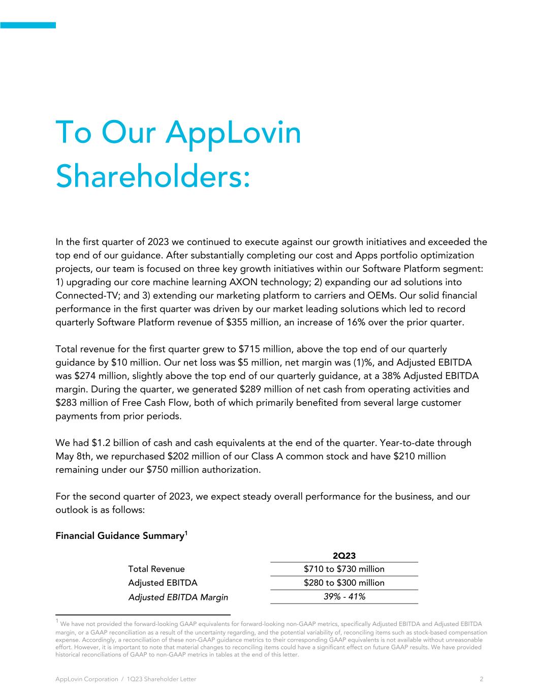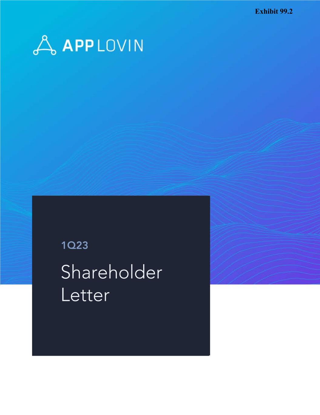 To Our AppLovin Shareholders: In the first quarter of 2023 we continued to execute against our growth initiatives and exceeded the top end of our guidance. After substantially completing our cost and Apps portfolio optimization projects, our team is focused on three key growth initiatives within our Software Platform segment: 1) upgrading our core machine learning AXON technology; 2) expanding our ad solutions into Connected-TV; and 3) extending our marketing platform to carriers and OEMs. Our solid financial performance in the first quarter was driven by our market leading solutions which led to record quarterly Software Platform revenue of $355 million, an increase of 16% over the prior quarter. Total revenue for the first quarter grew to $715 million, above the top end of our quarterly guidance by $10 million. Our net loss was $5 million, net margin was (1)%, and Adjusted EBITDA was $274 million, slightly above the top end of our quarterly guidance, at a 38% Adjusted EBITDA margin. During the quarter, we generated $289 million of net cash from operating activities and $283 million of Free Cash Flow, both of which primarily benefited from several large customer payments from prior periods. We had $1.2 billion of cash and cash equivalents at the end of the quarter. Year-to-date through May 8th, we repurchased $202 million of our Class A common stock and have $210 million remaining under our $750 million authorization. For the second quarter of 2023, we expect steady overall performance for the business, and our outlook is as follows: Financial Guidance Summary1 2Q23 Total Revenue $710 to $730 million Adjusted EBITDA $280 to $300 million Adjusted EBITDA Margin 39% - 41% AppLovin Corporation / 1Q23 Shareholder Letter 2 1 We have not provided the forward-looking GAAP equivalents for forward-looking non-GAAP metrics, specifically Adjusted EBITDA and Adjusted EBITDA margin, or a GAAP reconciliation as a result of the uncertainty regarding, and the potential variability of, reconciling items such as stock-based compensation expense. Accordingly, a reconciliation of these non-GAAP guidance metrics to their corresponding GAAP equivalents is not available without unreasonable effort. However, it is important to note that material changes to reconciling items could have a significant effect on future GAAP results. We have provided historical reconciliations of GAAP to non-GAAP metrics in tables at the end of this letter.