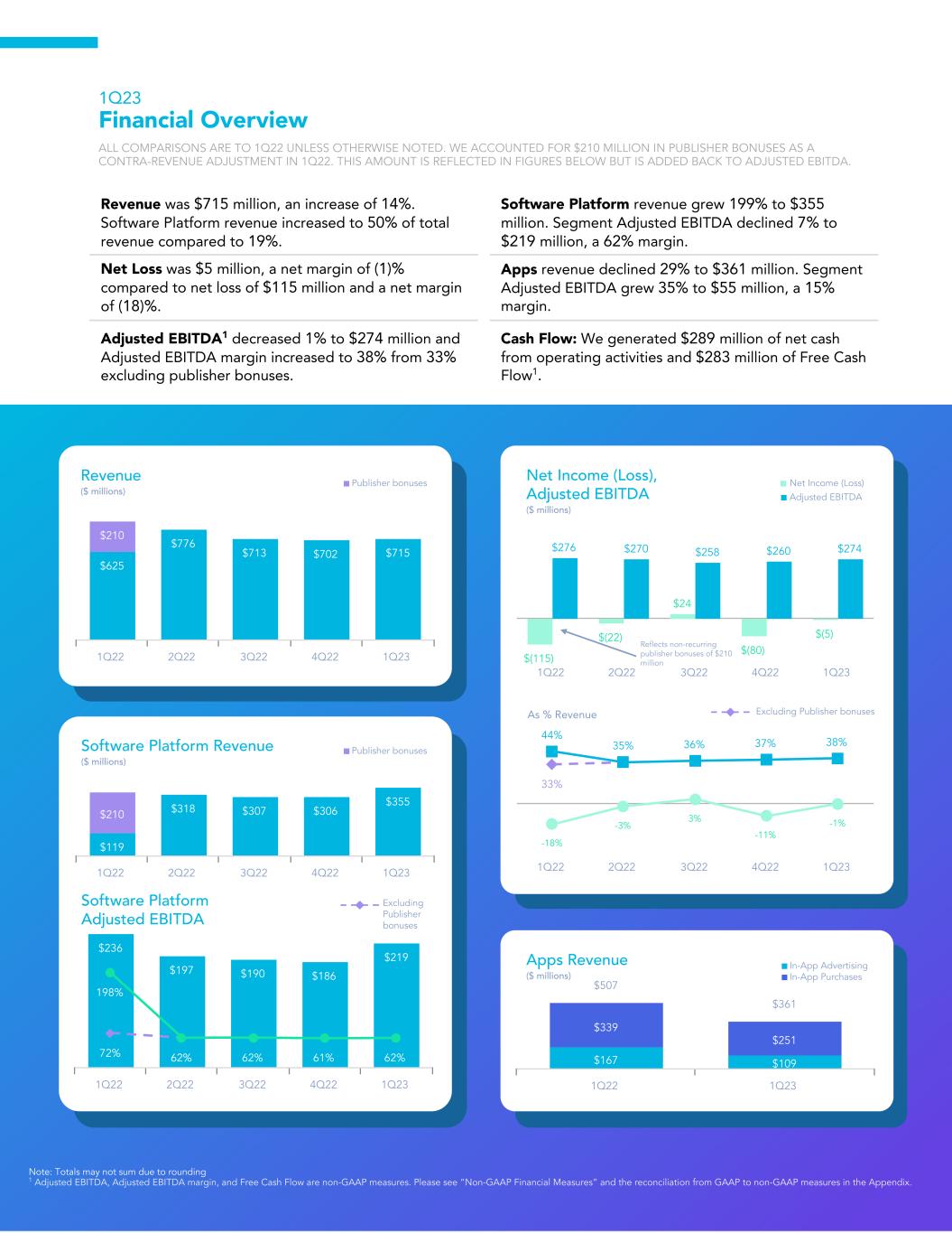 $625 $776 $713 $702 $715 $210 1Q22 2Q22 3Q22 4Q22 1Q23 Revenue ($ millions) Publisher bonuses $119 $318 $307 $306 $355 $210 1Q22 2Q22 3Q22 4Q22 1Q23 Software Platform Revenue ($ millions) Publisher bonuses $236 $197 $190 $186 $219 72% 62% 198% 62% 61% 62% 1Q22 2Q22 3Q22 4Q22 1Q23 Software Platform Adjusted EBITDA Excluding Publisher bonuses $(115) $(22) $24 $(80) $(5) $276 $270 $258 $260 $274 1Q22 2Q22 3Q22 4Q22 1Q23 Net Income (Loss), Adjusted EBITDA ($ millions) Net Income (Loss) Adjusted EBITDA Reflects non-recurring publisher bonuses of $210 million 33% 44% 35% 36% 37% 38% -18% -3% 3% -11% -1% 1Q22 2Q22 3Q22 4Q22 1Q23 As % Revenue Excluding Publisher bonuses $167 $109 $339 $251 $507 $361 1Q22 1Q23 Apps Revenue ($ millions) In-App Advertising In-App Purchases 1Q23 Financial Overview ALL COMPARISONS ARE TO 1Q22 UNLESS OTHERWISE NOTED. WE ACCOUNTED FOR $210 MILLION IN PUBLISHER BONUSES AS A CONTRA-REVENUE ADJUSTMENT IN 1Q22. THIS AMOUNT IS REFLECTED IN FIGURES BELOW BUT IS ADDED BACK TO ADJUSTED EBITDA. Revenue was $715 million, an increase of 14%. Software Platform revenue increased to 50% of total revenue compared to 19%. Software Platform revenue grew 199% to $355 million. Segment Adjusted EBITDA declined 7% to $219 million, a 62% margin. Net Loss was $5 million, a net margin of (1)% compared to net loss of $115 million and a net margin of (18)%. Apps revenue declined 29% to $361 million. Segment Adjusted EBITDA grew 35% to $55 million, a 15% margin. Adjusted EBITDA1 decreased 1% to $274 million and Adjusted EBITDA margin increased to 38% from 33% excluding publisher bonuses. Cash Flow: We generated $289 million of net cash from operating activities and $283 million of Free Cash Flow1. Note: Totals may not sum due to rounding 1 Adjusted EBITDA, Adjusted EBITDA margin, and Free Cash Flow are non-GAAP measures. Please see “Non-GAAP Financial Measures” and the reconciliation from GAAP to non-GAAP measures in the Appendix.