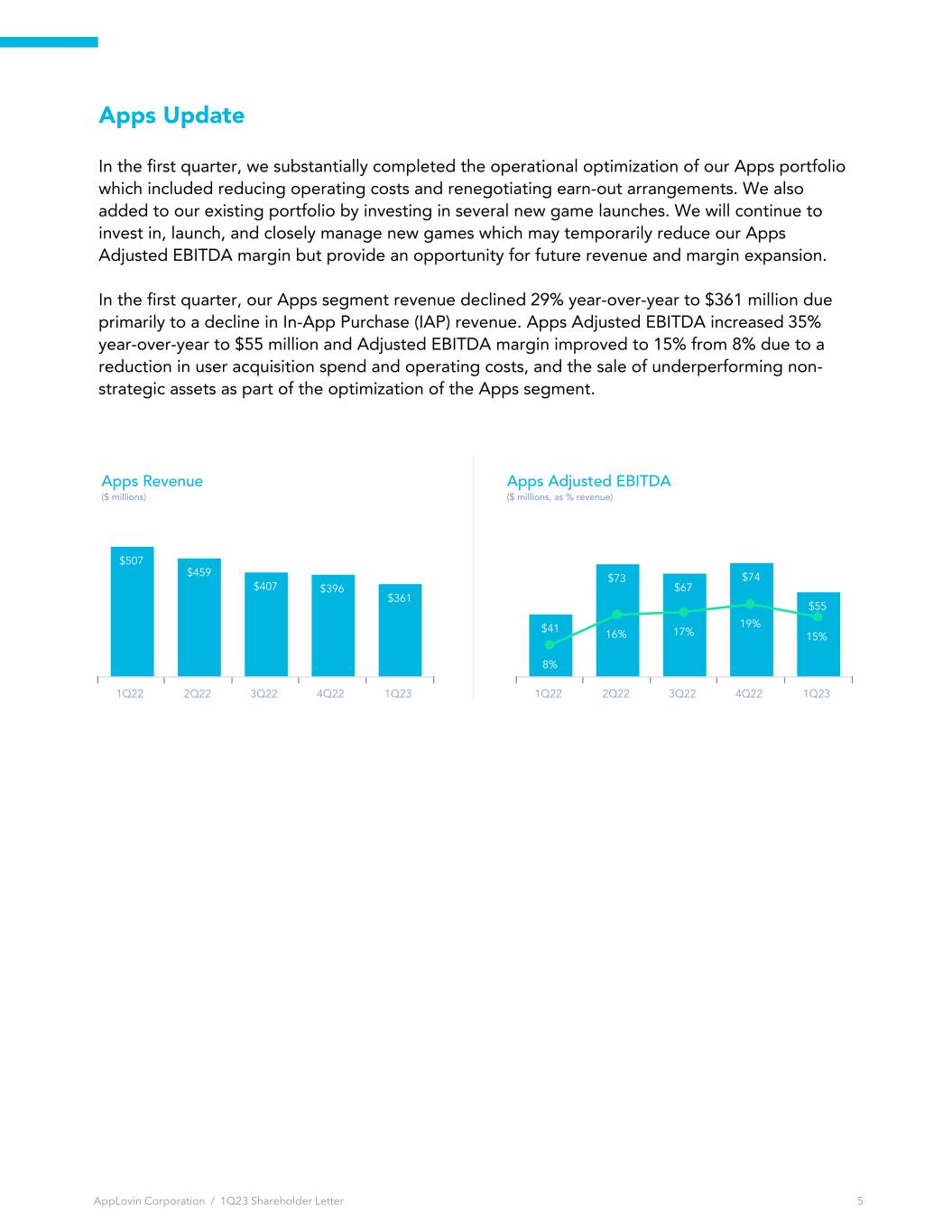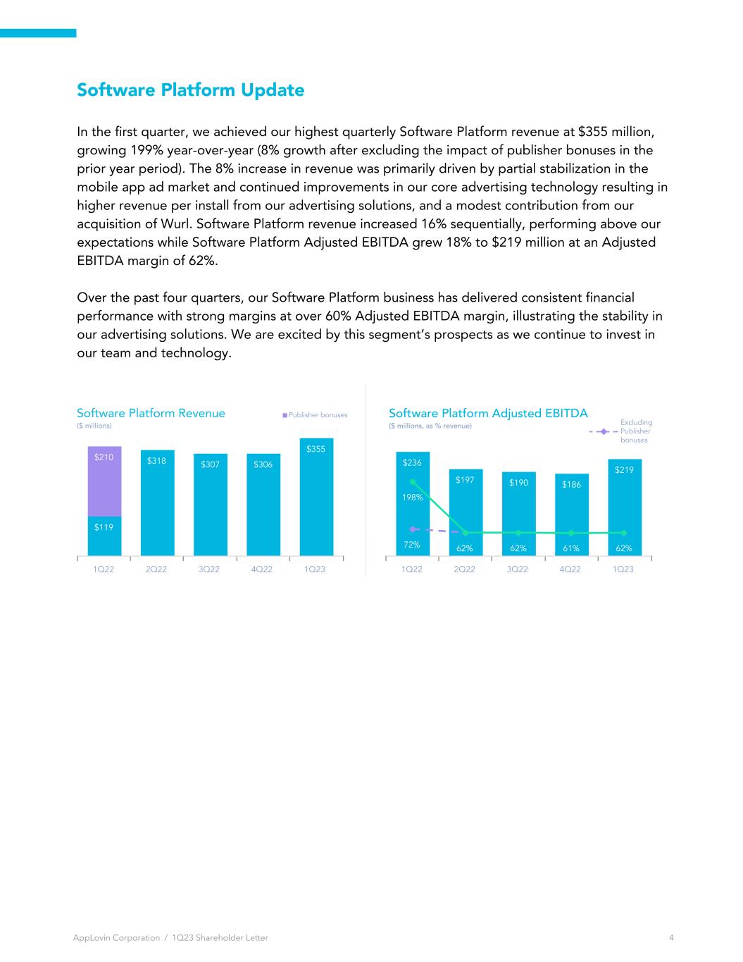 Software Platform Update In the first quarter, we achieved our highest quarterly Software Platform revenue at $355 million, growing 199% year-over-year (8% growth after excluding the impact of publisher bonuses in the prior year period). The 8% increase in revenue was primarily driven by partial stabilization in the mobile app ad market and continued improvements in our core advertising technology resulting in higher revenue per install from our advertising solutions, and a modest contribution from our acquisition of Wurl. Software Platform revenue increased 16% sequentially, performing above our expectations while Software Platform Adjusted EBITDA grew 18% to $219 million at an Adjusted EBITDA margin of 62%. Over the past four quarters, our Software Platform business has delivered consistent financial performance with strong margins at over 60% Adjusted EBITDA margin, illustrating the stability in our advertising solutions. We are excited by this segment’s prospects as we continue to invest in our team and technology. $119 $318 $307 $306 $355 $210 1Q22 2Q22 3Q22 4Q22 1Q23 Software Platform Revenue ($ millions) Publisher bonuses $236 $197 $190 $186 $219 72% 62% 198% 62% 61% 62% 1Q22 2Q22 3Q22 4Q22 1Q23 Software Platform Adjusted EBITDA ($ millions, as % revenue) Excluding Publisher bonuses AppLovin Corporation / 1Q23 Shareholder Letter 4