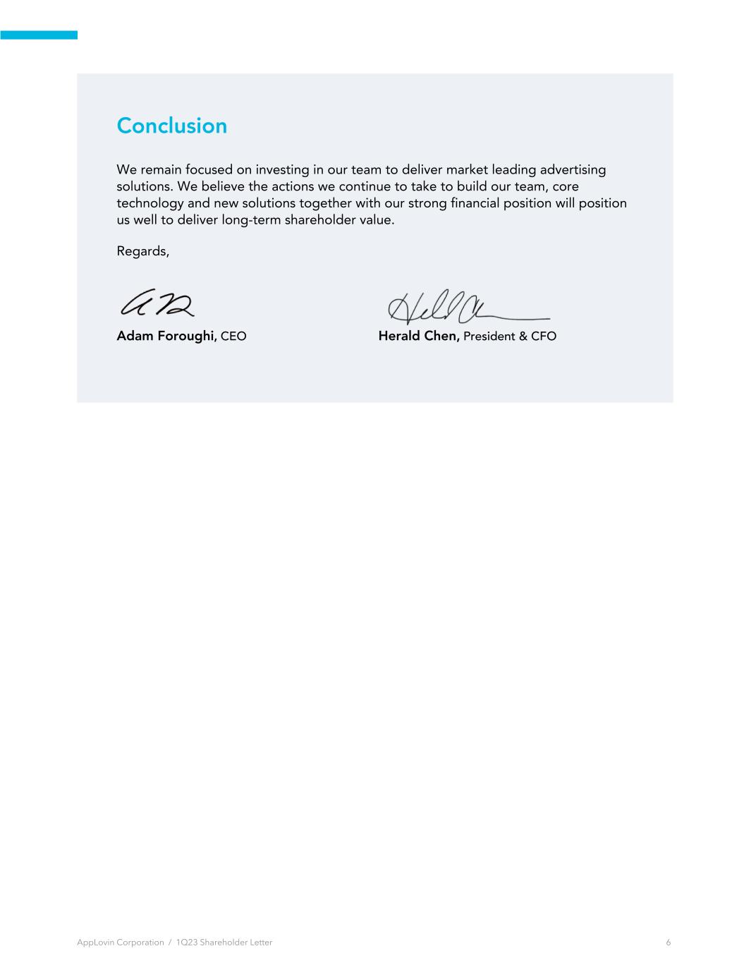 Conclusion We remain focused on investing in our team to deliver market leading advertising solutions. We believe the actions we continue to take to build our team, core technology and new solutions together with our strong financial position will position us well to deliver long-term shareholder value. Regards, Adam Foroughi, CEO Herald Chen, President & CFO AppLovin Corporation / 1Q23 Shareholder Letter 6