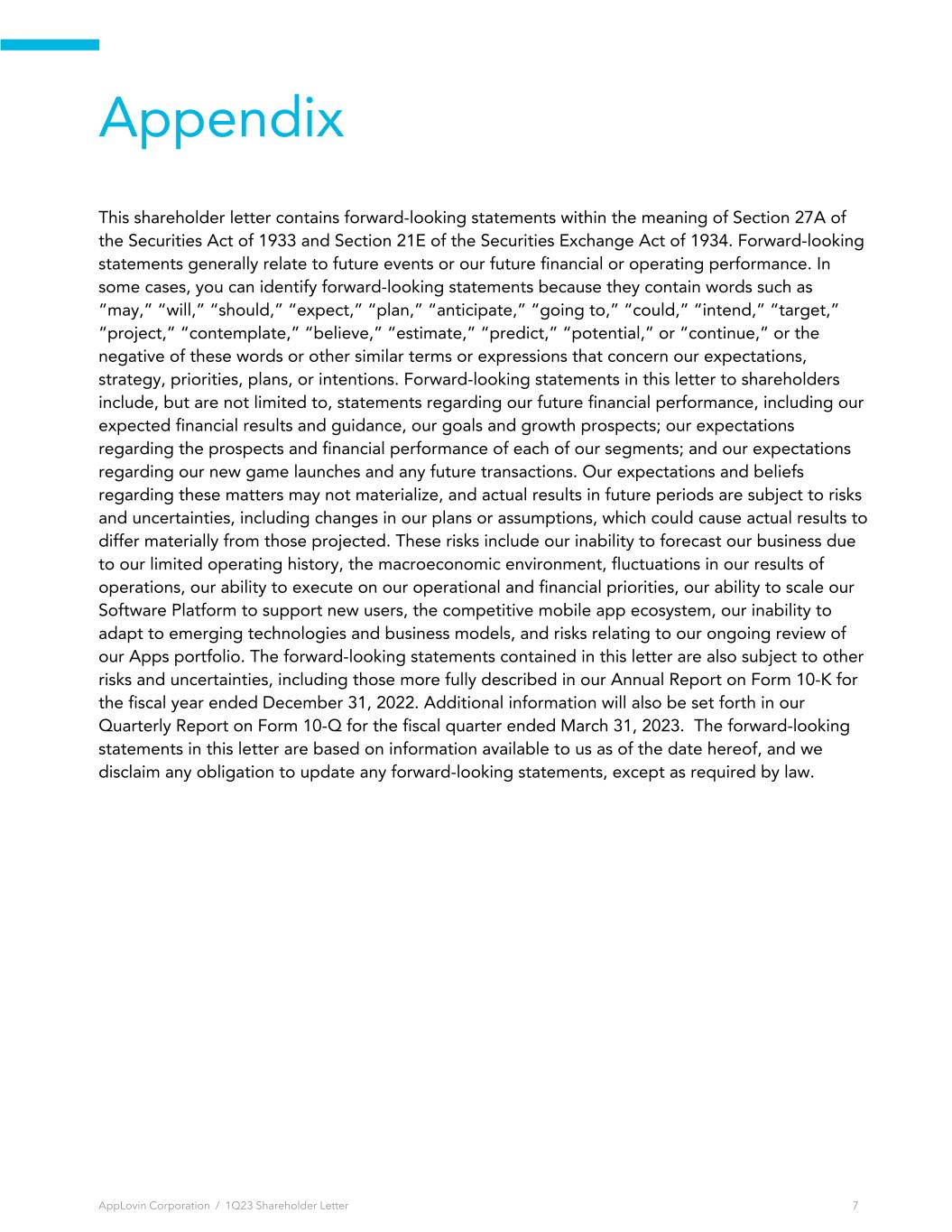 Appendix This shareholder letter contains forward-looking statements within the meaning of Section 27A of the Securities Act of 1933 and Section 21E of the Securities Exchange Act of 1934. Forward-looking statements generally relate to future events or our future financial or operating performance. In some cases, you can identify forward-looking statements because they contain words such as “may,” “will,” “should,” “expect,” “plan,” “anticipate,” “going to,” “could,” “intend,” “target,” “project,” “contemplate,” “believe,” “estimate,” “predict,” “potential,” or “continue,” or the negative of these words or other similar terms or expressions that concern our expectations, strategy, priorities, plans, or intentions. Forward-looking statements in this letter to shareholders include, but are not limited to, statements regarding our future financial performance, including our expected financial results and guidance, our goals and growth prospects; our expectations regarding the prospects and financial performance of each of our segments; and our expectations regarding our new game launches and any future transactions. Our expectations and beliefs regarding these matters may not materialize, and actual results in future periods are subject to risks and uncertainties, including changes in our plans or assumptions, which could cause actual results to differ materially from those projected. These risks include our inability to forecast our business due to our limited operating history, the macroeconomic environment, fluctuations in our results of operations, our ability to execute on our operational and financial priorities, our ability to scale our Software Platform to support new users, the competitive mobile app ecosystem, our inability to adapt to emerging technologies and business models, and risks relating to our ongoing review of our Apps portfolio. The forward-looking statements contained in this letter are also subject to other risks and uncertainties, including those more fully described in our Annual Report on Form 10-K for the fiscal year ended December 31, 2022. Additional information will also be set forth in our Quarterly Report on Form 10-Q for the fiscal quarter ended March 31, 2023. The forward-looking statements in this letter are based on information available to us as of the date hereof, and we disclaim any obligation to update any forward-looking statements, except as required by law. AppLovin Corporation / 1Q23 Shareholder Letter 7