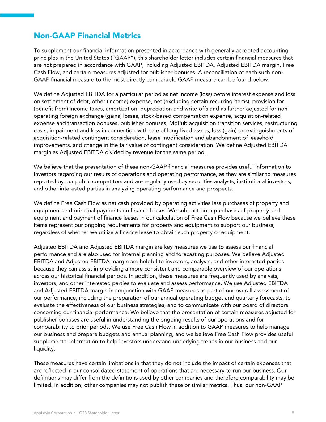 Non-GAAP Financial Metrics To supplement our financial information presented in accordance with generally accepted accounting principles in the United States (“GAAP”), this shareholder letter includes certain financial measures that are not prepared in accordance with GAAP, including Adjusted EBITDA, Adjusted EBITDA margin, Free Cash Flow, and certain measures adjusted for publisher bonuses. A reconciliation of each such non- GAAP financial measure to the most directly comparable GAAP measure can be found below. We define Adjusted EBITDA for a particular period as net income (loss) before interest expense and loss on settlement of debt, other (income) expense, net (excluding certain recurring items), provision for (benefit from) income taxes, amortization, depreciation and write-offs and as further adjusted for non- operating foreign exchange (gains) losses, stock-based compensation expense, acquisition-related expense and transaction bonuses, publisher bonuses, MoPub acquisition transition services, restructuring costs, impairment and loss in connection with sale of long-lived assets, loss (gain) on extinguishments of acquisition-related contingent consideration, lease modification and abandonment of leasehold improvements, and change in the fair value of contingent consideration. We define Adjusted EBITDA margin as Adjusted EBITDA divided by revenue for the same period. We believe that the presentation of these non-GAAP financial measures provides useful information to investors regarding our results of operations and operating performance, as they are similar to measures reported by our public competitors and are regularly used by securities analysts, institutional investors, and other interested parties in analyzing operating performance and prospects. We define Free Cash Flow as net cash provided by operating activities less purchases of property and equipment and principal payments on finance leases. We subtract both purchases of property and equipment and payment of finance leases in our calculation of Free Cash Flow because we believe these items represent our ongoing requirements for property and equipment to support our business, regardless of whether we utilize a finance lease to obtain such property or equipment. Adjusted EBITDA and Adjusted EBITDA margin are key measures we use to assess our financial performance and are also used for internal planning and forecasting purposes. We believe Adjusted EBITDA and Adjusted EBITDA margin are helpful to investors, analysts, and other interested parties because they can assist in providing a more consistent and comparable overview of our operations across our historical financial periods. In addition, these measures are frequently used by analysts, investors, and other interested parties to evaluate and assess performance. We use Adjusted EBITDA and Adjusted EBITDA margin in conjunction with GAAP measures as part of our overall assessment of our performance, including the preparation of our annual operating budget and quarterly forecasts, to evaluate the effectiveness of our business strategies, and to communicate with our board of directors concerning our financial performance. We believe that the presentation of certain measures adjusted for publisher bonuses are useful in understanding the ongoing results of our operations and for comparability to prior periods. We use Free Cash Flow in addition to GAAP measures to help manage our business and prepare budgets and annual planning, and we believe Free Cash Flow provides useful supplemental information to help investors understand underlying trends in our business and our liquidity. These measures have certain limitations in that they do not include the impact of certain expenses that are reflected in our consolidated statement of operations that are necessary to run our business. Our definitions may differ from the definitions used by other companies and therefore comparability may be limited. In addition, other companies may not publish these or similar metrics. Thus, our non-GAAP AppLovin Corporation / 1Q23 Shareholder Letter 8