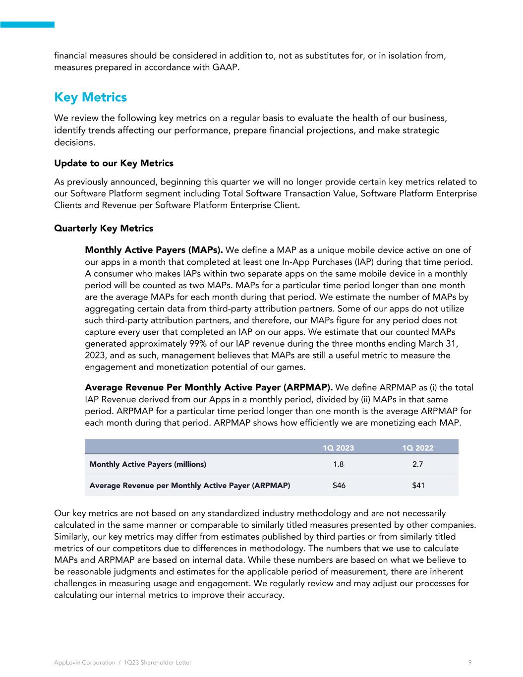 financial measures should be considered in addition to, not as substitutes for, or in isolation from, measures prepared in accordance with GAAP. Key Metrics We review the following key metrics on a regular basis to evaluate the health of our business, identify trends affecting our performance, prepare financial projections, and make strategic decisions. Update to our Key Metrics As previously announced, beginning this quarter we will no longer provide certain key metrics related to our Software Platform segment including Total Software Transaction Value, Software Platform Enterprise Clients and Revenue per Software Platform Enterprise Client. Quarterly Key Metrics Monthly Active Payers (MAPs). We define a MAP as a unique mobile device active on one of our apps in a month that completed at least one In-App Purchases (IAP) during that time period. A consumer who makes IAPs within two separate apps on the same mobile device in a monthly period will be counted as two MAPs. MAPs for a particular time period longer than one month are the average MAPs for each month during that period. We estimate the number of MAPs by aggregating certain data from third-party attribution partners. Some of our apps do not utilize such third-party attribution partners, and therefore, our MAPs figure for any period does not capture every user that completed an IAP on our apps. We estimate that our counted MAPs generated approximately 99% of our IAP revenue during the three months ending March 31, 2023, and as such, management believes that MAPs are still a useful metric to measure the engagement and monetization potential of our games. Average Revenue Per Monthly Active Payer (ARPMAP). We define ARPMAP as (i) the total IAP Revenue derived from our Apps in a monthly period, divided by (ii) MAPs in that same period. ARPMAP for a particular time period longer than one month is the average ARPMAP for each month during that period. ARPMAP shows how efficiently we are monetizing each MAP. 1Q 2023 1Q 2022 Monthly Active Payers (millions) 1.8 2.7 Average Revenue per Monthly Active Payer (ARPMAP) $46 $41 Our key metrics are not based on any standardized industry methodology and are not necessarily calculated in the same manner or comparable to similarly titled measures presented by other companies. Similarly, our key metrics may differ from estimates published by third parties or from similarly titled metrics of our competitors due to differences in methodology. The numbers that we use to calculate MAPs and ARPMAP are based on internal data. While these numbers are based on what we believe to be reasonable judgments and estimates for the applicable period of measurement, there are inherent challenges in measuring usage and engagement. We regularly review and may adjust our processes for calculating our internal metrics to improve their accuracy. AppLovin Corporation / 1Q23 Shareholder Letter 9