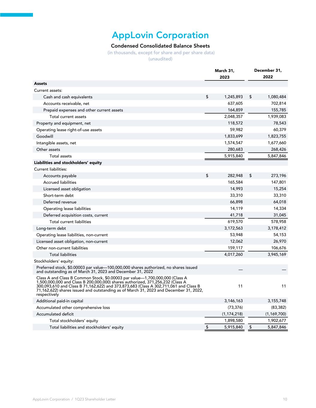 AppLovin Corporation Condensed Consolidated Balance Sheets (in thousands, except for share and per share data) (unaudited) March 31, December 31, 2023 2022 Assets Current assets: Cash and cash equivalents $ 1,245,893 $ 1,080,484 Accounts receivable, net 637,605 702,814 Prepaid expenses and other current assets 164,859 155,785 Total current assets 2,048,357 1,939,083 Property and equipment, net 118,572 78,543 Operating lease right-of-use assets 59,982 60,379 Goodwill 1,833,699 1,823,755 Intangible assets, net 1,574,547 1,677,660 Other assets 280,683 268,426 Total assets 5,915,840 5,847,846 Liabilities and stockholders’ equity Current liabilities: Accounts payable $ 282,948 $ 273,196 Accrued liabilities 165,584 147,801 Licensed asset obligation 14,993 15,254 Short-term debt 33,310 33,310 Deferred revenue 66,898 64,018 Operating lease liabilities 14,119 14,334 Deferred acquisition costs, current 41,718 31,045 Total current liabilities 619,570 578,958 Long-term debt 3,172,563 3,178,412 Operating lease liabilities, non-current 53,948 54,153 Licensed asset obligation, non-current 12,062 26,970 Other non-current liabilities 159,117 106,676 Total liabilities 4,017,260 3,945,169 Stockholders’ equity: Preferred stock, $0.00003 par value—100,000,000 shares authorized, no shares issued and outstanding as of March 31, 2023 and December 31, 2022 — — Class A and Class B Common Stock, $0.00003 par value—1,700,000,000 (Class A 1,500,000,000 and Class B 200,000,000) shares authorized, 371,256,232 (Class A 300,093,610 and Class B 71,162,622) and 373,873,683 (Class A 302,711,061 and Class B 71,162,622) shares issued and outstanding as of March 31, 2023 and December 31, 2022, respectively 11 11 Additional paid-in capital 3,146,163 3,155,748 Accumulated other comprehensive loss (73,376) (83,382) Accumulated deficit (1,174,218) (1,169,700) Total stockholders’ equity 1,898,580 1,902,677 Total liabilities and stockholders’ equity $ 5,915,840 $ 5,847,846 AppLovin Corporation / 1Q23 Shareholder Letter 10