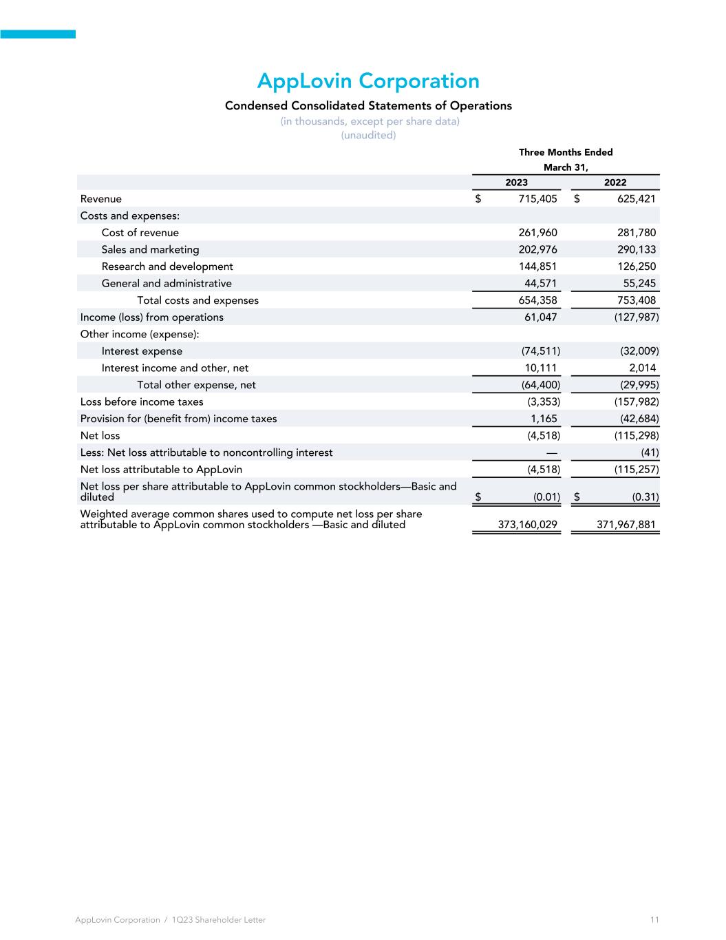 AppLovin Corporation Condensed Consolidated Statements of Operations (in thousands, except per share data) (unaudited) Three Months Ended March 31, 2023 2022 Revenue $ 715,405 $ 625,421 Costs and expenses: Cost of revenue 261,960 281,780 Sales and marketing 202,976 290,133 Research and development 144,851 126,250 General and administrative 44,571 55,245 Total costs and expenses 654,358 753,408 Income (loss) from operations 61,047 (127,987) Other income (expense): Interest expense (74,511) (32,009) Interest income and other, net 10,111 2,014 Total other expense, net (64,400) (29,995) Loss before income taxes (3,353) (157,982) Provision for (benefit from) income taxes 1,165 (42,684) Net loss (4,518) (115,298) Less: Net loss attributable to noncontrolling interest — (41) Net loss attributable to AppLovin (4,518) (115,257) Net loss per share attributable to AppLovin common stockholders—Basic and diluted $ (0.01) $ (0.31) Weighted average common shares used to compute net loss per share attributable to AppLovin common stockholders —Basic and diluted 373,160,029 371,967,881 AppLovin Corporation / 1Q23 Shareholder Letter 11