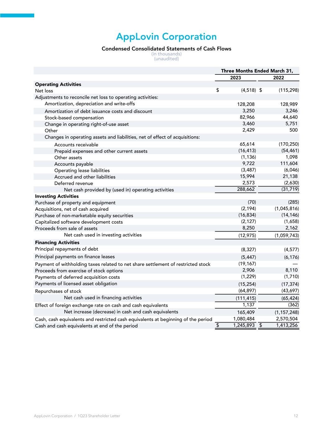 AppLovin Corporation Condensed Consolidated Statements of Cash Flows (in thousands) (unaudited) Three Months Ended March 31, 2023 2022 Operating Activities Net loss $ (4,518) $ (115,298) Adjustments to reconcile net loss to operating activities: Amortization, depreciation and write-offs 128,208 128,989 Amortization of debt issuance costs and discount 3,250 3,246 Stock-based compensation 82,966 44,640 Change in operating right-of-use asset 3,460 5,751 Other 2,429 500 Changes in operating assets and liabilities, net of effect of acquisitions: Accounts receivable 65,614 (170,250) Prepaid expenses and other current assets (16,413) (54,461) Other assets (1,136) 1,098 Accounts payable 9,722 111,604 Operating lease liabilities (3,487) (6,046) Accrued and other liabilities 15,994 21,138 Deferred revenue 2,573 (2,630) Net cash provided by (used in) operating activities 288,662 (31,719) Investing Activities Purchase of property and equipment (70) (285) Acquisitions, net of cash acquired (2,194) (1,045,816) Purchase of non-marketable equity securities (16,834) (14,146) Capitalized software development costs (2,127) (1,658) Proceeds from sale of assets 8,250 2,162 Net cash used in investing activities (12,975) (1,059,743) Financing Activities Principal repayments of debt (8,327) (4,577) Principal payments on finance leases (5,447) (6,176) Payment of withholding taxes related to net share settlement of restricted stock units (19,167) — Proceeds from exercise of stock options 2,906 8,110 Payments of deferred acquisition costs (1,229) (1,710) Payments of licensed asset obligation (15,254) (17,374) Repurchases of stock (64,897) (43,697) Net cash used in financing activities (111,415) (65,424) Effect of foreign exchange rate on cash and cash equivalents 1,137 (362) Net increase (decrease) in cash and cash equivalents 165,409 (1,157,248) Cash, cash equivalents and restricted cash equivalents at beginning of the period 1,080,484 2,570,504 Cash and cash equivalents at end of the period $ 1,245,893 $ 1,413,256 AppLovin Corporation / 1Q23 Shareholder Letter 12