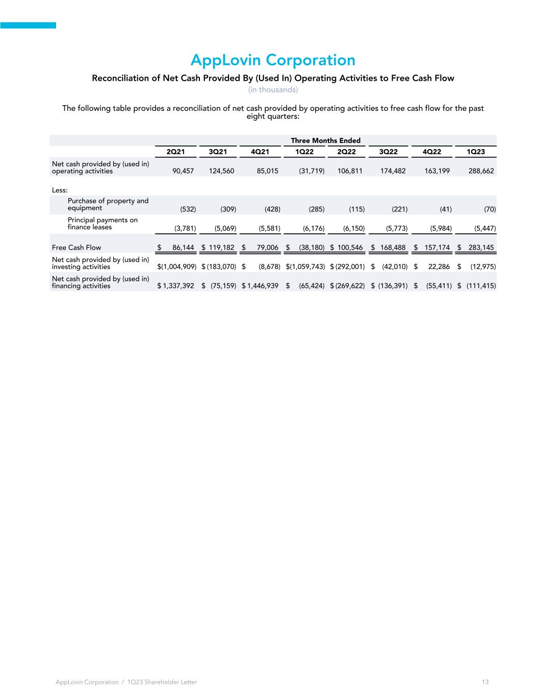 AppLovin Corporation Reconciliation of Net Cash Provided By (Used In) Operating Activities to Free Cash Flow (in thousands) The following table provides a reconciliation of net cash provided by operating activities to free cash flow for the past eight quarters: Three Months Ended 2Q21 3Q21 4Q21 1Q22 2Q22 3Q22 4Q22 1Q23 Net cash provided by (used in) operating activities 90,457 124,560 85,015 (31,719) 106,811 174,482 163,199 288,662 Less: Purchase of property and equipment (532) (309) (428) (285) (115) (221) (41) (70) Principal payments on finance leases (3,781) (5,069) (5,581) (6,176) (6,150) (5,773) (5,984) (5,447) Free Cash Flow $ 86,144 $ 119,182 $ 79,006 $ (38,180) $ 100,546 $ 168,488 $ 157,174 $ 283,145 Net cash provided by (used in) investing activities $ (1,004,909) $ (183,070) $ (8,678) $ (1,059,743) $ (292,001) $ (42,010) $ 22,286 $ (12,975) Net cash provided by (used in) financing activities $ 1,337,392 $ (75,159) $ 1,446,939 $ (65,424) $ (269,622) $ (136,391) $ (55,411) $ (111,415) AppLovin Corporation / 1Q23 Shareholder Letter 13