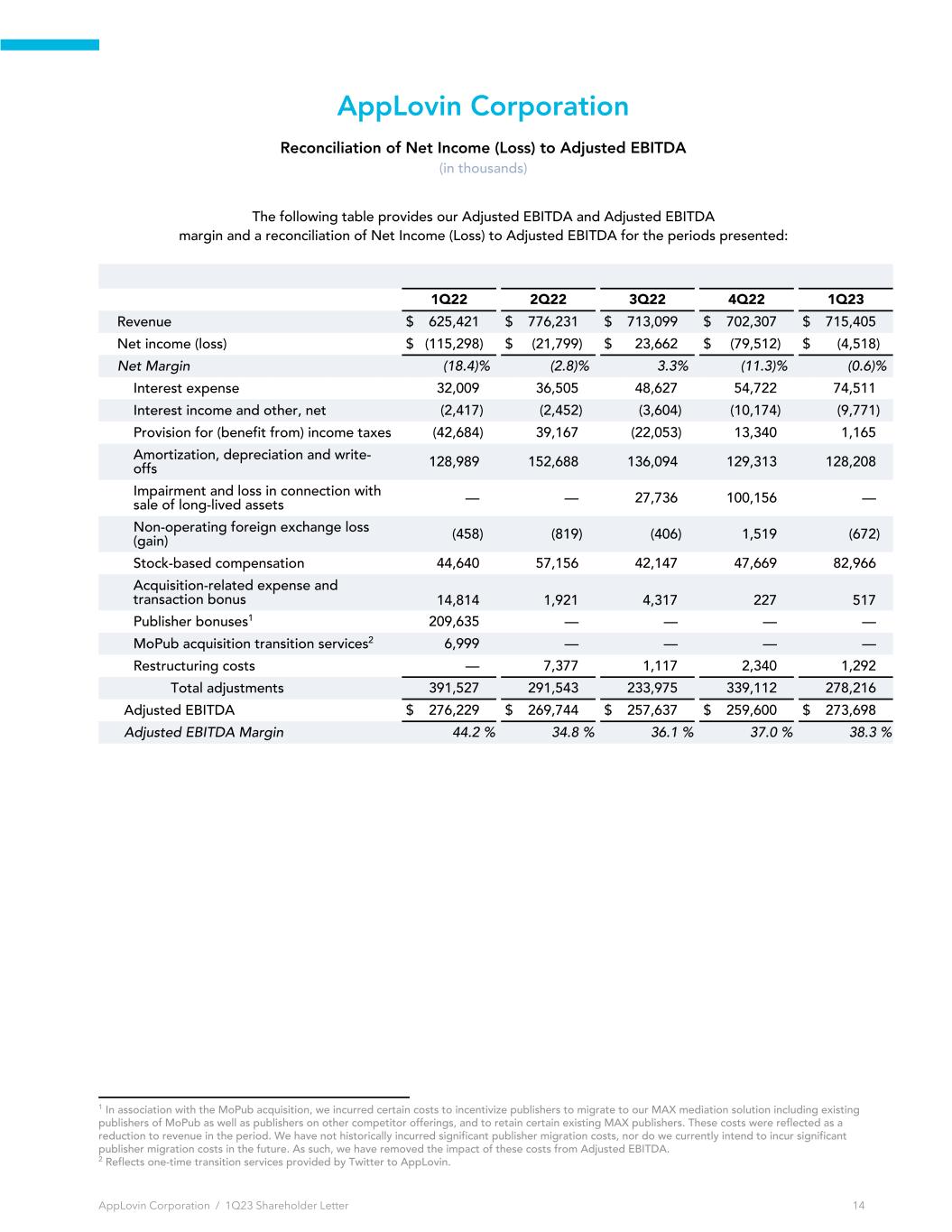 AppLovin Corporation Reconciliation of Net Income (Loss) to Adjusted EBITDA (in thousands) The following table provides our Adjusted EBITDA and Adjusted EBITDA margin and a reconciliation of Net Income (Loss) to Adjusted EBITDA for the periods presented: 1Q22 2Q22 3Q22 4Q22 1Q23 Revenue $ 625,421 $ 776,231 $ 713,099 $ 702,307 $ 715,405 Net income (loss) $ (115,298) $ (21,799) $ 23,662 $ (79,512) $ (4,518) Net Margin (18.4) % (2.8) % 3.3 % (11.3) % (0.6) % Interest expense 32,009 36,505 48,627 54,722 74,511 Interest income and other, net (2,417) (2,452) (3,604) (10,174) (9,771) Provision for (benefit from) income taxes (42,684) 39,167 (22,053) 13,340 1,165 Amortization, depreciation and write- offs 128,989 152,688 136,094 129,313 128,208 Impairment and loss in connection with sale of long-lived assets — — 27,736 100,156 — Non-operating foreign exchange loss (gain) (458) (819) (406) 1,519 (672) Stock-based compensation 44,640 57,156 42,147 47,669 82,966 Acquisition-related expense and transaction bonus 14,814 1,921 4,317 227 517 Publisher bonuses1 209,635 — — — — MoPub acquisition transition services2 6,999 — — — — Restructuring costs — 7,377 1,117 2,340 1,292 Total adjustments 391,527 291,543 233,975 339,112 278,216 Adjusted EBITDA $ 276,229 $ 269,744 $ 257,637 $ 259,600 $ 273,698 Adjusted EBITDA Margin 44.2 % 34.8 % 36.1 % 37.0 % 38.3 % AppLovin Corporation / 1Q23 Shareholder Letter 14 1 In association with the MoPub acquisition, we incurred certain costs to incentivize publishers to migrate to our MAX mediation solution including existing publishers of MoPub as well as publishers on other competitor offerings, and to retain certain existing MAX publishers. These costs were reflected as a reduction to revenue in the period. We have not historically incurred significant publisher migration costs, nor do we currently intend to incur significant publisher migration costs in the future. As such, we have removed the impact of these costs from Adjusted EBITDA. 2 Reflects one-time transition services provided by Twitter to AppLovin.