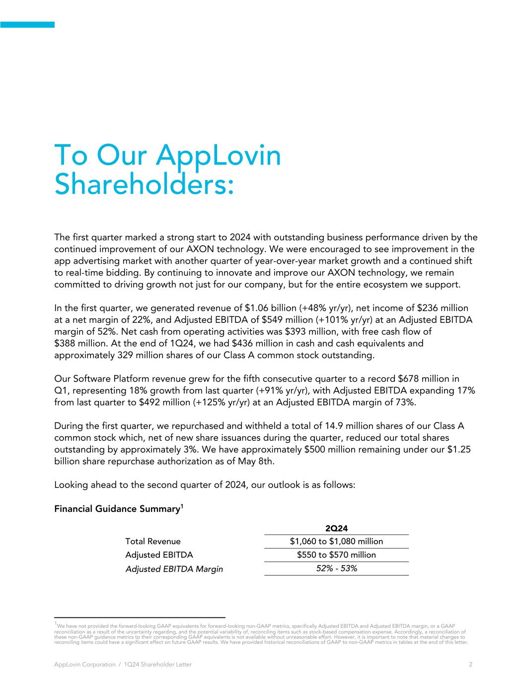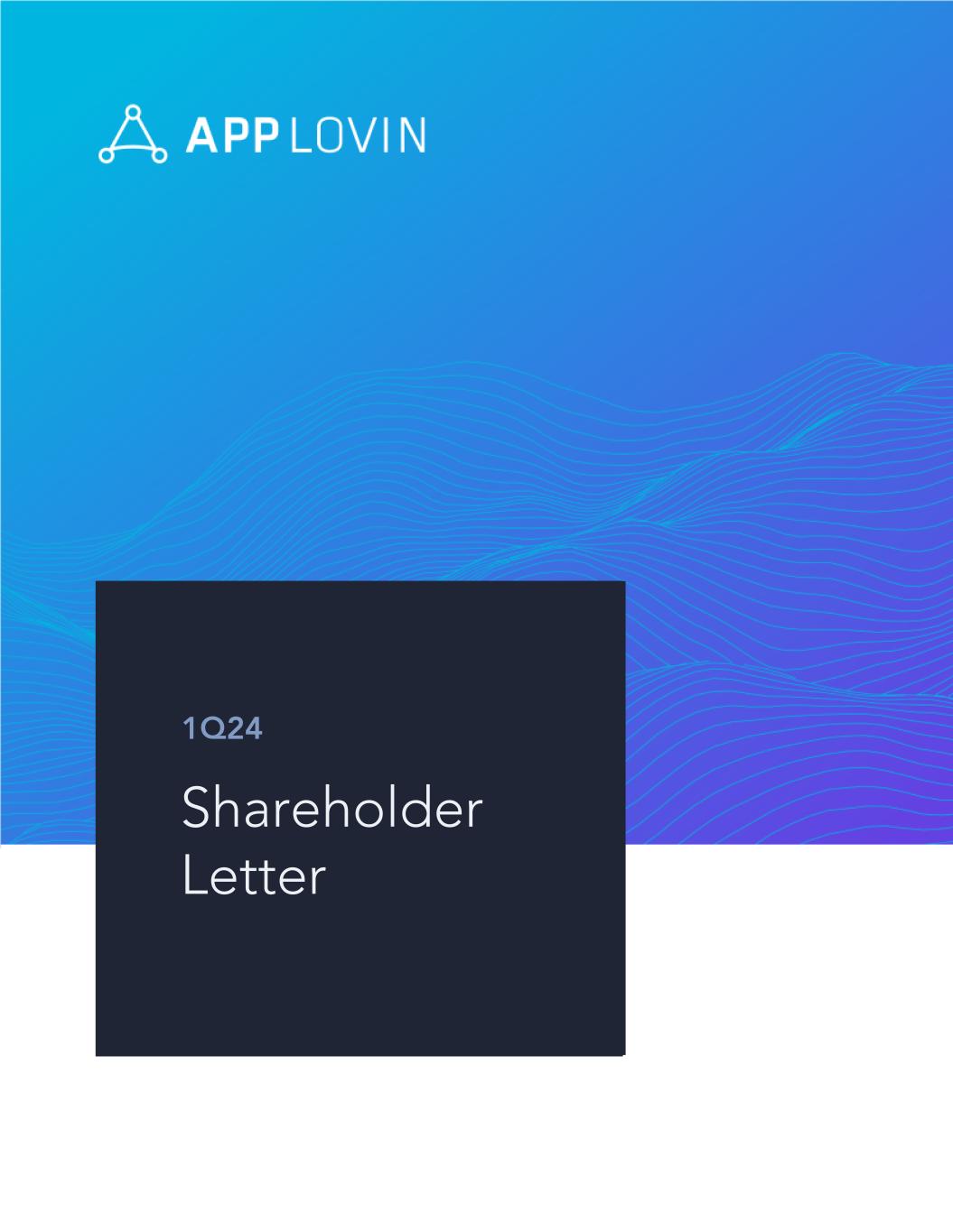 To Our AppLovin Shareholders: The first quarter marked a strong start to 2024 with outstanding business performance driven by the continued improvement of our AXON technology. We were encouraged to see improvement in the app advertising market with another quarter of year-over-year market growth and a continued shift to real-time bidding. By continuing to innovate and improve our AXON technology, we remain committed to driving growth not just for our company, but for the entire ecosystem we support. In the first quarter, we generated revenue of $1.06 billion (+48% yr/yr), net income of $236 million at a net margin of 22%, and Adjusted EBITDA of $549 million (+101% yr/yr) at an Adjusted EBITDA margin of 52%. Net cash from operating activities was $393 million, with free cash flow of $388 million. At the end of 1Q24, we had $436 million in cash and cash equivalents and approximately 329 million shares of our Class A common stock outstanding. Our Software Platform revenue grew for the fifth consecutive quarter to a record $678 million in Q1, representing 18% growth from last quarter (+91% yr/yr), with Adjusted EBITDA expanding 17% from last quarter to $492 million (+125% yr/yr) at an Adjusted EBITDA margin of 73%. During the first quarter, we repurchased and withheld a total of 14.9 million shares of our Class A common stock which, net of new share issuances during the quarter, reduced our total shares outstanding by approximately 3%. We have approximately $500 million remaining under our $1.25 billion share repurchase authorization as of May 8th. Looking ahead to the second quarter of 2024, our outlook is as follows: Financial Guidance Summary1 2Q24 Total Revenue $1,060 to $1,080 million Adjusted EBITDA $550 to $570 million Adjusted EBITDA Margin 52% - 53% AppLovin Corporation / 1Q24 Shareholder Letter 2 1We have not provided the forward-looking GAAP equivalents for forward-looking non-GAAP metrics, specifically Adjusted EBITDA and Adjusted EBITDA margin, or a GAAP reconciliation as a result of the uncertainty regarding, and the potential variability of, reconciling items such as stock-based compensation expense. Accordingly, a reconciliation of these non-GAAP guidance metrics to their corresponding GAAP equivalents is not available without unreasonable effort. However, it is important to note that material changes to reconciling items could have a significant effect on future GAAP results. We have provided historical reconciliations of GAAP to non-GAAP metrics in tables at the end of this letter.