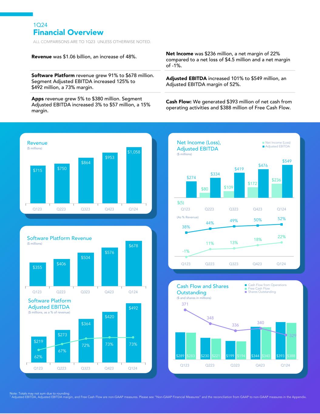 $715 $750 $864 $953 $1,058 Q123 Q223 Q323 Q423 Q124 Revenue ($ millions) $355 $406 $504 $576 $678 Q123 Q223 Q323 Q423 Q124 Software Platform Revenue ($ millions) $219 $273 $364 $420 $492 62% 67% 72% 73% 73% Q123 Q223 Q323 Q423 Q124 Software Platform Adjusted EBITDA ($ millions, as a % of revenue) $(5) $80 $109 $172 $236$274 $334 $419 $476 $549 Q123 Q223 Q323 Q423 Q124 Net Income (Loss), Adjusted EBITDA ($ millions) $289 $230 $199 $344 $393$283 $221 $194 $340 $388 371 348 336 340 329 Q123 Q223 Q323 Q423 Q124 Cash Flow and Shares Outstanding ($ and shares in millions) 1Q24 Financial Overview ALL COMPARISONS ARE TO 1Q23 UNLESS OTHERWISE NOTED. Note: Totals may not sum due to rounding 1 Adjusted EBITDA, Adjusted EBITDA margin, and Free Cash Flow are non-GAAP measures. Please see “Non-GAAP Financial Measures” and the reconciliation from GAAP to non-GAAP measures in the Appendix. Cash Flow from Operations Free Cash Flow Net Income (Loss) Shares Outstanding Adjusted EBITDA 38% 44% 49% 50% 52% -1% 11% 13% 18% 22% Q123 Q223 Q323 Q423 Q124 Revenue was $1.06 billion, an increase of 48%. Net Income was $236 million, a net margin of 22% compared to a net loss of $4.5 million and a net margin of -1%. Software Platform revenue grew 91% to $678 million. Segment Adjusted EBITDA increased 125% to $492 million, a 73% margin. Adjusted EBITDA increased 101% to $549 million, an Adjusted EBITDA margin of 52%. Apps revenue grew 5% to $380 million. Segment Adjusted EBITDA increased 3% to $57 million, a 15% margin. Cash Flow: We generated $393 million of net cash from operating activities and $388 million of Free Cash Flow. (As % Revenue)