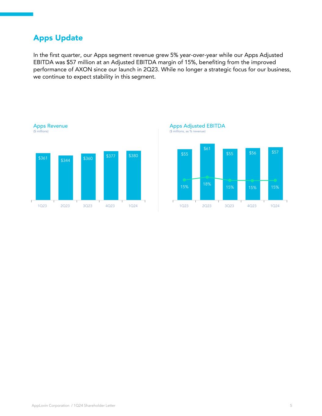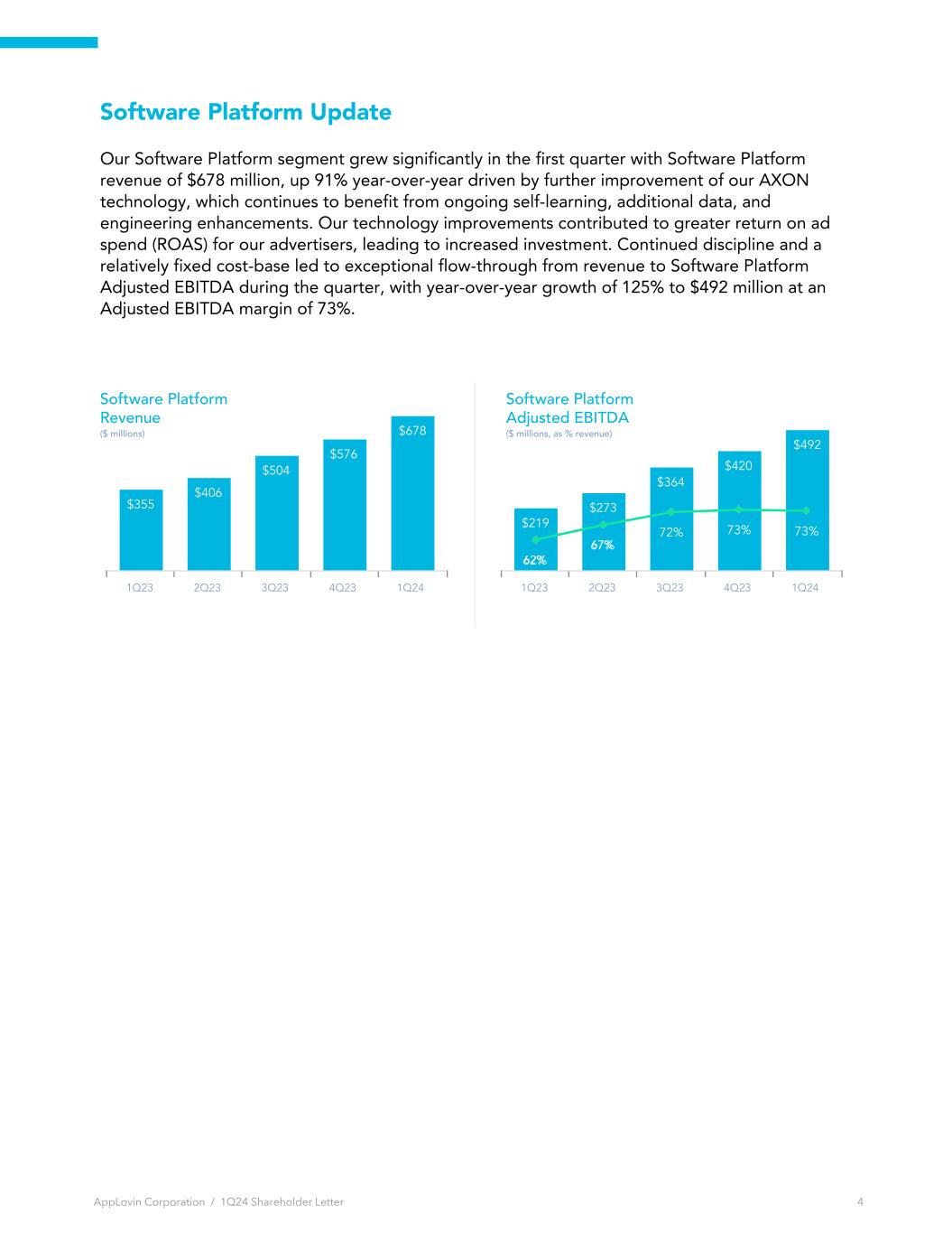 Software Platform Update Our Software Platform segment grew significantly in the first quarter with Software Platform revenue of $678 million, up 91% year-over-year driven by further improvement of our AXON technology, which continues to benefit from ongoing self-learning, additional data, and engineering enhancements. Our technology improvements contributed to greater return on ad spend (ROAS) for our advertisers, leading to increased investment. Continued discipline and a relatively fixed cost-base led to exceptional flow-through from revenue to Software Platform Adjusted EBITDA during the quarter, with year-over-year growth of 125% to $492 million at an Adjusted EBITDA margin of 73%. $355 $406 $504 $576 $678 1Q23 2Q23 3Q23 4Q23 1Q24 $219 $273 $364 $420 $492 62% 67% 72% 73% 73% 1Q23 2Q23 3Q23 4Q23 1Q24 AppLovin Corporation / 1Q24 Shareholder Letter 4 Software Platform Revenue ($ millions) Software Platform Adjusted EBITDA ($ millions, as % revenue)