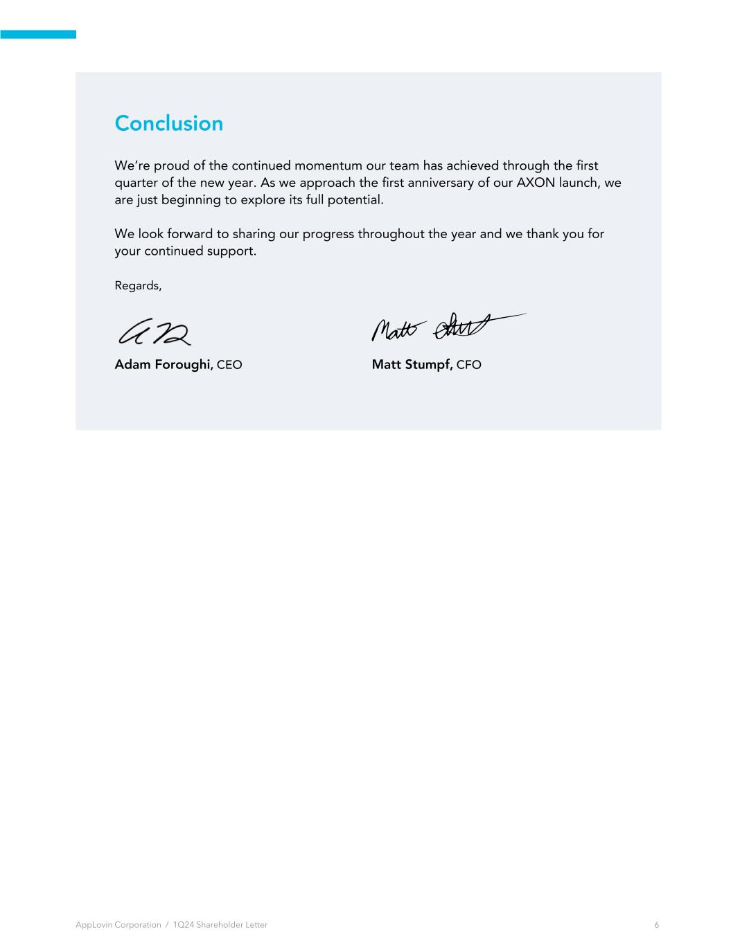 Conclusion We’re proud of the continued momentum our team has achieved through the first quarter of the new year. As we approach the first anniversary of our AXON launch, we are just beginning to explore its full potential. We look forward to sharing our progress throughout the year and we thank you for your continued support. Regards, Adam Foroughi, CEO Matt Stumpf, CFO AppLovin Corporation / 1Q24 Shareholder Letter 6