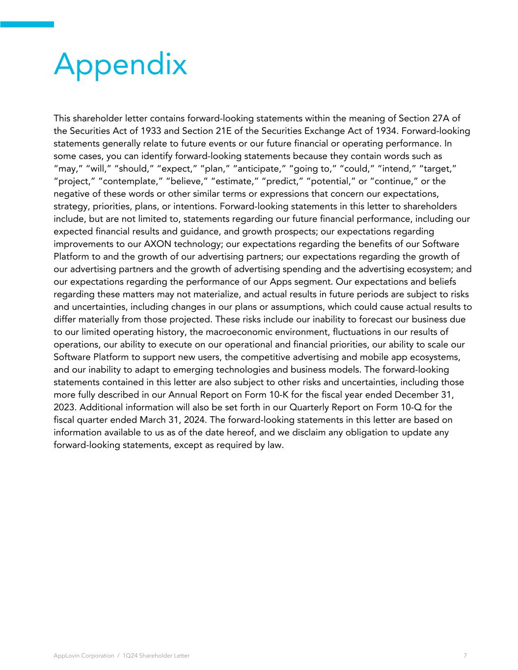 Appendix This shareholder letter contains forward-looking statements within the meaning of Section 27A of the Securities Act of 1933 and Section 21E of the Securities Exchange Act of 1934. Forward-looking statements generally relate to future events or our future financial or operating performance. In some cases, you can identify forward-looking statements because they contain words such as “may,” “will,” “should,” “expect,” “plan,” “anticipate,” “going to,” “could,” “intend,” “target,” “project,” “contemplate,” “believe,” “estimate,” “predict,” “potential,” or “continue,” or the negative of these words or other similar terms or expressions that concern our expectations, strategy, priorities, plans, or intentions. Forward-looking statements in this letter to shareholders include, but are not limited to, statements regarding our future financial performance, including our expected financial results and guidance, and growth prospects; our expectations regarding improvements to our AXON technology; our expectations regarding the benefits of our Software Platform to and the growth of our advertising partners; our expectations regarding the growth of our advertising partners and the growth of advertising spending and the advertising ecosystem; and our expectations regarding the performance of our Apps segment. Our expectations and beliefs regarding these matters may not materialize, and actual results in future periods are subject to risks and uncertainties, including changes in our plans or assumptions, which could cause actual results to differ materially from those projected. These risks include our inability to forecast our business due to our limited operating history, the macroeconomic environment, fluctuations in our results of operations, our ability to execute on our operational and financial priorities, our ability to scale our Software Platform to support new users, the competitive advertising and mobile app ecosystems, and our inability to adapt to emerging technologies and business models. The forward-looking statements contained in this letter are also subject to other risks and uncertainties, including those more fully described in our Annual Report on Form 10-K for the fiscal year ended December 31, 2023. Additional information will also be set forth in our Quarterly Report on Form 10-Q for the fiscal quarter ended March 31, 2024. The forward-looking statements in this letter are based on information available to us as of the date hereof, and we disclaim any obligation to update any forward-looking statements, except as required by law. AppLovin Corporation / 1Q24 Shareholder Letter 7