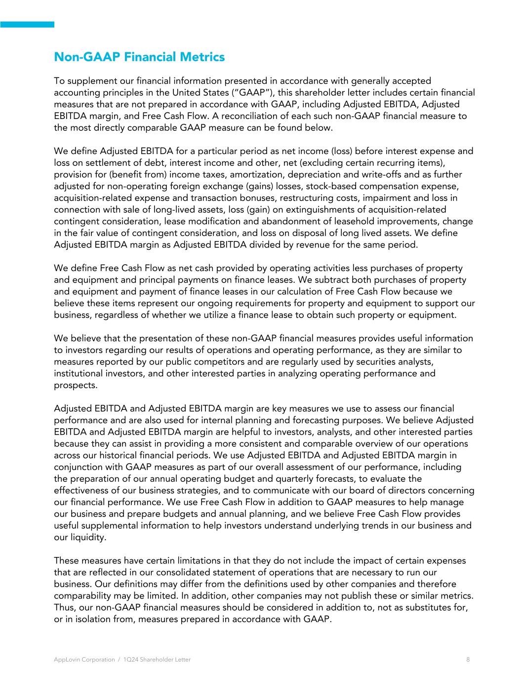 Non-GAAP Financial Metrics To supplement our financial information presented in accordance with generally accepted accounting principles in the United States (“GAAP”), this shareholder letter includes certain financial measures that are not prepared in accordance with GAAP, including Adjusted EBITDA, Adjusted EBITDA margin, and Free Cash Flow. A reconciliation of each such non-GAAP financial measure to the most directly comparable GAAP measure can be found below. We define Adjusted EBITDA for a particular period as net income (loss) before interest expense and loss on settlement of debt, interest income and other, net (excluding certain recurring items), provision for (benefit from) income taxes, amortization, depreciation and write-offs and as further adjusted for non-operating foreign exchange (gains) losses, stock-based compensation expense, acquisition-related expense and transaction bonuses, restructuring costs, impairment and loss in connection with sale of long-lived assets, loss (gain) on extinguishments of acquisition-related contingent consideration, lease modification and abandonment of leasehold improvements, change in the fair value of contingent consideration, and loss on disposal of long lived assets. We define Adjusted EBITDA margin as Adjusted EBITDA divided by revenue for the same period. We define Free Cash Flow as net cash provided by operating activities less purchases of property and equipment and principal payments on finance leases. We subtract both purchases of property and equipment and payment of finance leases in our calculation of Free Cash Flow because we believe these items represent our ongoing requirements for property and equipment to support our business, regardless of whether we utilize a finance lease to obtain such property or equipment. We believe that the presentation of these non-GAAP financial measures provides useful information to investors regarding our results of operations and operating performance, as they are similar to measures reported by our public competitors and are regularly used by securities analysts, institutional investors, and other interested parties in analyzing operating performance and prospects. Adjusted EBITDA and Adjusted EBITDA margin are key measures we use to assess our financial performance and are also used for internal planning and forecasting purposes. We believe Adjusted EBITDA and Adjusted EBITDA margin are helpful to investors, analysts, and other interested parties because they can assist in providing a more consistent and comparable overview of our operations across our historical financial periods. We use Adjusted EBITDA and Adjusted EBITDA margin in conjunction with GAAP measures as part of our overall assessment of our performance, including the preparation of our annual operating budget and quarterly forecasts, to evaluate the effectiveness of our business strategies, and to communicate with our board of directors concerning our financial performance. We use Free Cash Flow in addition to GAAP measures to help manage our business and prepare budgets and annual planning, and we believe Free Cash Flow provides useful supplemental information to help investors understand underlying trends in our business and our liquidity. These measures have certain limitations in that they do not include the impact of certain expenses that are reflected in our consolidated statement of operations that are necessary to run our business. Our definitions may differ from the definitions used by other companies and therefore comparability may be limited. In addition, other companies may not publish these or similar metrics. Thus, our non-GAAP financial measures should be considered in addition to, not as substitutes for, or in isolation from, measures prepared in accordance with GAAP. AppLovin Corporation / 1Q24 Shareholder Letter 8