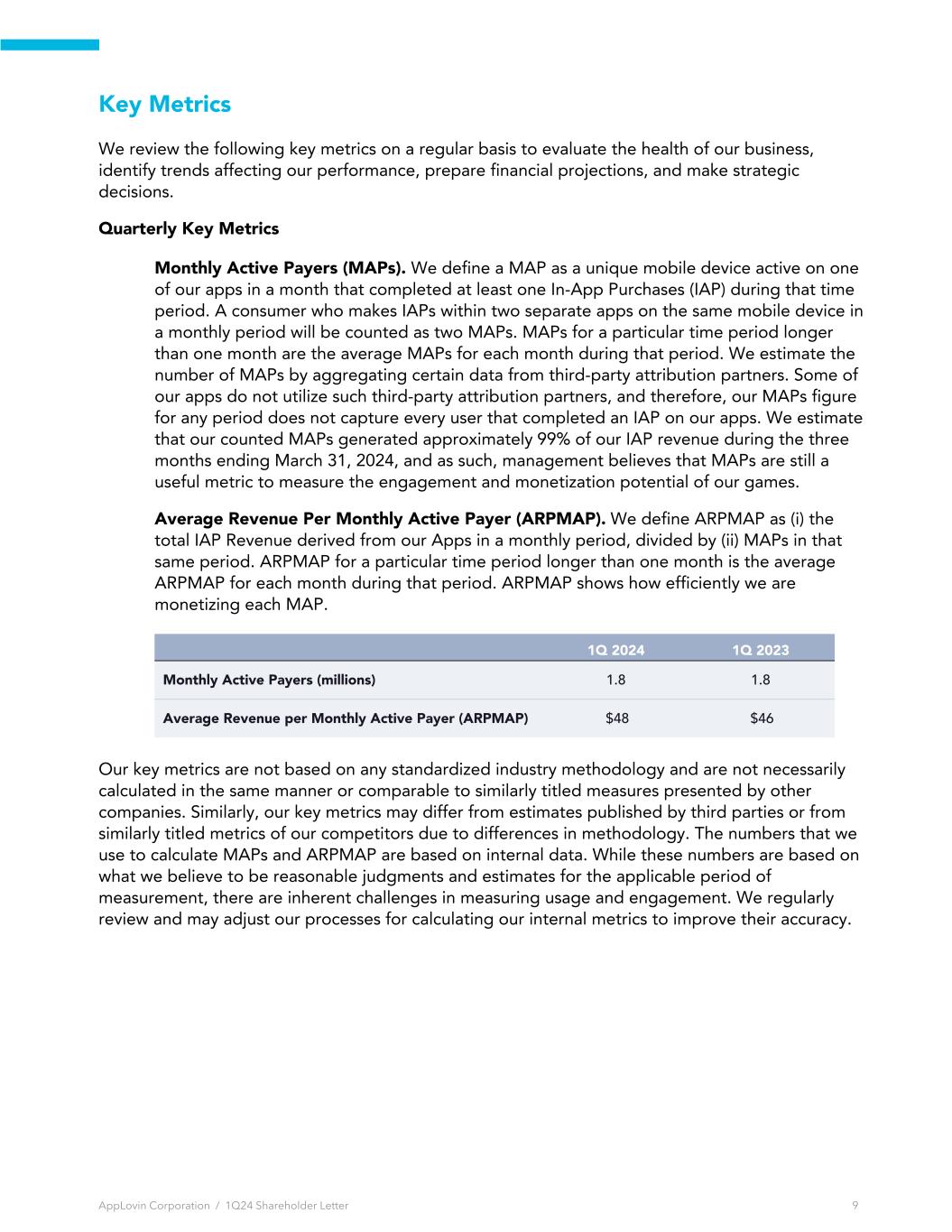 Key Metrics We review the following key metrics on a regular basis to evaluate the health of our business, identify trends affecting our performance, prepare financial projections, and make strategic decisions. Quarterly Key Metrics Monthly Active Payers (MAPs). We define a MAP as a unique mobile device active on one of our apps in a month that completed at least one In-App Purchases (IAP) during that time period. A consumer who makes IAPs within two separate apps on the same mobile device in a monthly period will be counted as two MAPs. MAPs for a particular time period longer than one month are the average MAPs for each month during that period. We estimate the number of MAPs by aggregating certain data from third-party attribution partners. Some of our apps do not utilize such third-party attribution partners, and therefore, our MAPs figure for any period does not capture every user that completed an IAP on our apps. We estimate that our counted MAPs generated approximately 99% of our IAP revenue during the three months ending March 31, 2024, and as such, management believes that MAPs are still a useful metric to measure the engagement and monetization potential of our games. Average Revenue Per Monthly Active Payer (ARPMAP). We define ARPMAP as (i) the total IAP Revenue derived from our Apps in a monthly period, divided by (ii) MAPs in that same period. ARPMAP for a particular time period longer than one month is the average ARPMAP for each month during that period. ARPMAP shows how efficiently we are monetizing each MAP. 1Q 2024 1Q 2023 Monthly Active Payers (millions) 1.8 1.8 Average Revenue per Monthly Active Payer (ARPMAP) $48 $46 Our key metrics are not based on any standardized industry methodology and are not necessarily calculated in the same manner or comparable to similarly titled measures presented by other companies. Similarly, our key metrics may differ from estimates published by third parties or from similarly titled metrics of our competitors due to differences in methodology. The numbers that we use to calculate MAPs and ARPMAP are based on internal data. While these numbers are based on what we believe to be reasonable judgments and estimates for the applicable period of measurement, there are inherent challenges in measuring usage and engagement. We regularly review and may adjust our processes for calculating our internal metrics to improve their accuracy. AppLovin Corporation / 1Q24 Shareholder Letter 9