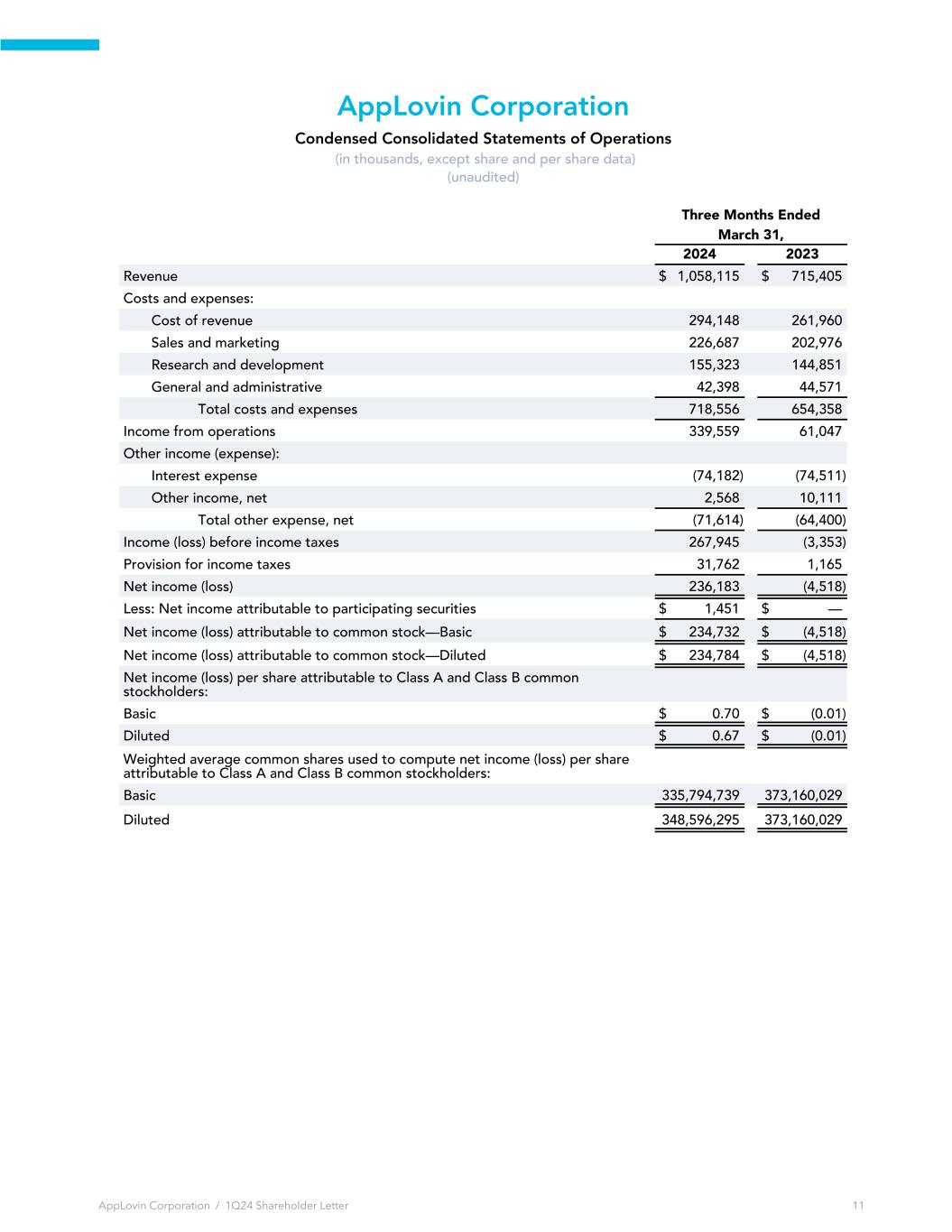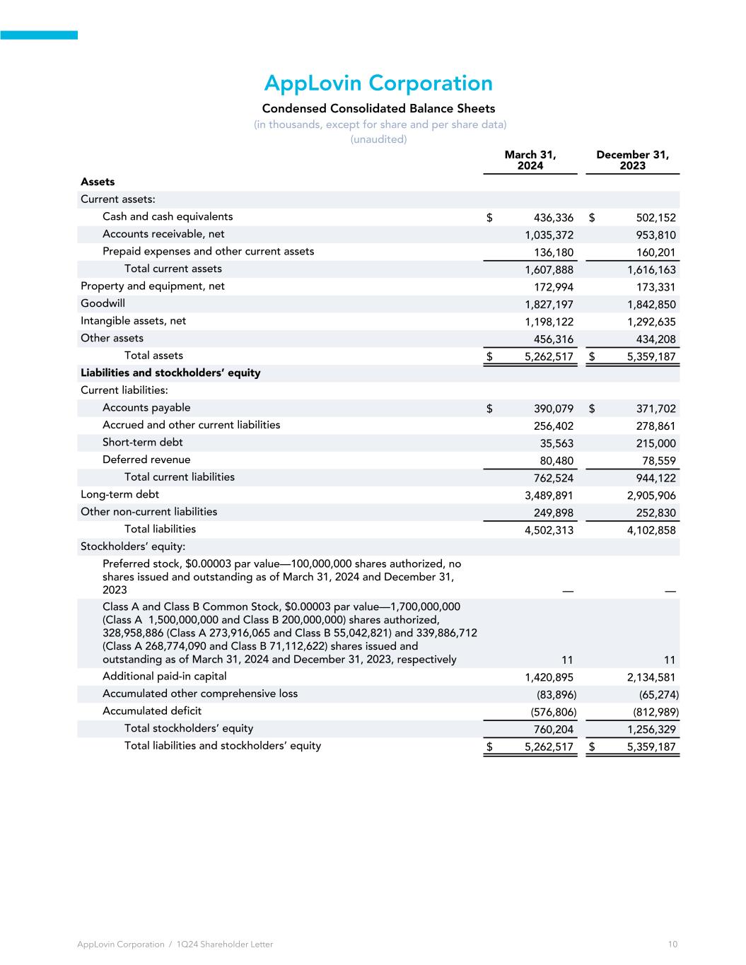 AppLovin Corporation Condensed Consolidated Balance Sheets (in thousands, except for share and per share data) (unaudited) March 31, 2024 December 31, 2023 Assets Current assets: Cash and cash equivalents $ 436,336 $ 502,152 Accounts receivable, net 1,035,372 953,810 Prepaid expenses and other current assets 136,180 160,201 Total current assets 1,607,888 1,616,163 Property and equipment, net 172,994 173,331 Goodwill 1,827,197 1,842,850 Intangible assets, net 1,198,122 1,292,635 Other assets 456,316 434,208 Total assets $ 5,262,517 $ 5,359,187 Liabilities and stockholders’ equity Current liabilities: Accounts payable $ 390,079 $ 371,702 Accrued and other current liabilities 256,402 278,861 Short-term debt 35,563 215,000 Deferred revenue 80,480 78,559 Total current liabilities 762,524 944,122 Long-term debt 3,489,891 2,905,906 Other non-current liabilities 249,898 252,830 Total liabilities 4,502,313 4,102,858 Stockholders’ equity: Preferred stock, $0.00003 par value—100,000,000 shares authorized, no shares issued and outstanding as of March 31, 2024 and December 31, 2023 — — Class A and Class B Common Stock, $0.00003 par value—1,700,000,000 (Class A 1,500,000,000 and Class B 200,000,000) shares authorized, 328,958,886 (Class A 273,916,065 and Class B 55,042,821) and 339,886,712 (Class A 268,774,090 and Class B 71,112,622) shares issued and outstanding as of March 31, 2024 and December 31, 2023, respectively 11 11 Additional paid-in capital 1,420,895 2,134,581 Accumulated other comprehensive loss (83,896) (65,274) Accumulated deficit (576,806) (812,989) Total stockholders’ equity 760,204 1,256,329 Total liabilities and stockholders’ equity $ 5,262,517 $ 5,359,187 AppLovin Corporation / 1Q24 Shareholder Letter 10