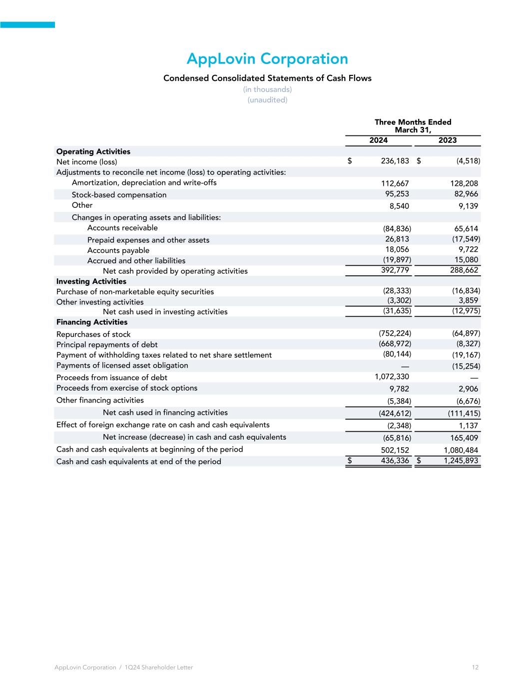 AppLovin Corporation Condensed Consolidated Statements of Cash Flows (in thousands) (unaudited) Three Months Ended March 31, 2024 2023 Operating Activities Net income (loss) $ 236,183 $ (4,518) Adjustments to reconcile net income (loss) to operating activities: Amortization, depreciation and write-offs 112,667 128,208 Stock-based compensation 95,253 82,966 Other 8,540 9,139 Changes in operating assets and liabilities: Accounts receivable (84,836) 65,614 Prepaid expenses and other assets 26,813 (17,549) Accounts payable 18,056 9,722 Accrued and other liabilities (19,897) 15,080 Net cash provided by operating activities 392,779 288,662 Investing Activities Purchase of non-marketable equity securities (28,333) (16,834) Other investing activities (3,302) 3,859 Net cash used in investing activities (31,635) (12,975) Financing Activities Repurchases of stock (752,224) (64,897) Principal repayments of debt (668,972) (8,327) Payment of withholding taxes related to net share settlement (80,144) (19,167) Payments of licensed asset obligation — (15,254) Proceeds from issuance of debt 1,072,330 — Proceeds from exercise of stock options 9,782 2,906 Other financing activities (5,384) (6,676) Net cash used in financing activities (424,612) (111,415) Effect of foreign exchange rate on cash and cash equivalents (2,348) 1,137 Net increase (decrease) in cash and cash equivalents (65,816) 165,409 Cash and cash equivalents at beginning of the period 502,152 1,080,484 Cash and cash equivalents at end of the period $ 436,336 $ 1,245,893 AppLovin Corporation / 1Q24 Shareholder Letter 12