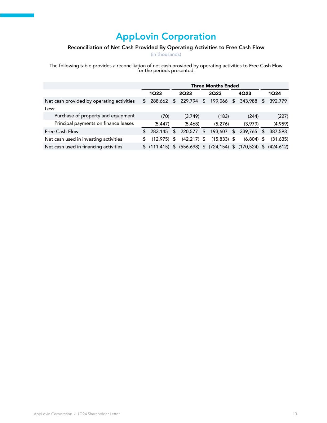 AppLovin Corporation Reconciliation of Net Cash Provided By Operating Activities to Free Cash Flow (in thousands) The following table provides a reconciliation of net cash provided by operating activities to Free Cash Flow for the periods presented: Three Months Ended 1Q23 2Q23 3Q23 4Q23 1Q24 Net cash provided by operating activities $ 288,662 $ 229,794 $ 199,066 $ 343,988 $ 392,779 Less: Purchase of property and equipment (70) (3,749) (183) (244) (227) Principal payments on finance leases (5,447) (5,468) (5,276) (3,979) (4,959) Free Cash Flow $ 283,145 $ 220,577 $ 193,607 $ 339,765 $ 387,593 Net cash used in investing activities $ (12,975) $ (42,217) $ (15,833) $ (6,804) $ (31,635) Net cash used in financing activities $ (111,415) $ (556,698) $ (724,154) $ (170,524) $ (424,612) AppLovin Corporation / 1Q24 Shareholder Letter 13