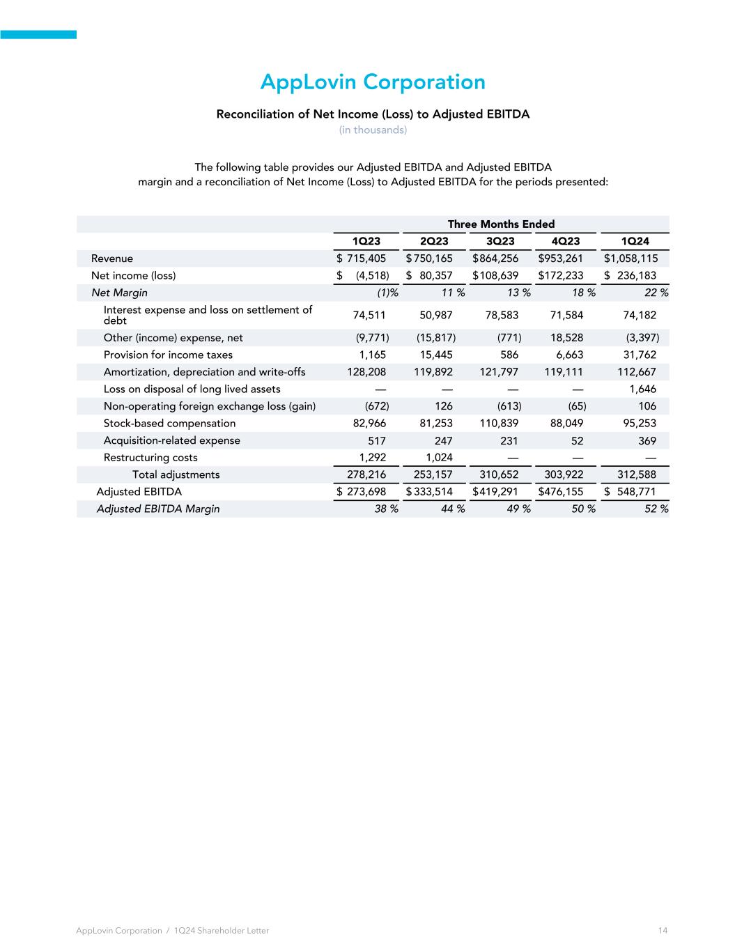 AppLovin Corporation Reconciliation of Net Income (Loss) to Adjusted EBITDA (in thousands) The following table provides our Adjusted EBITDA and Adjusted EBITDA margin and a reconciliation of Net Income (Loss) to Adjusted EBITDA for the periods presented: Three Months Ended 1Q23 2Q23 3Q23 4Q23 1Q24 Revenue $ 715,405 $ 750,165 $ 864,256 $ 953,261 $ 1,058,115 Net income (loss) $ (4,518) $ 80,357 $ 108,639 $ 172,233 $ 236,183 Net Margin (1) % 11 % 13 % 18 % 22 % Interest expense and loss on settlement of debt 74,511 50,987 78,583 71,584 74,182 Other (income) expense, net (9,771) (15,817) (771) 18,528 (3,397) Provision for income taxes 1,165 15,445 586 6,663 31,762 Amortization, depreciation and write-offs 128,208 119,892 121,797 119,111 112,667 Loss on disposal of long lived assets — — — — 1,646 Non-operating foreign exchange loss (gain) (672) 126 (613) (65) 106 Stock-based compensation 82,966 81,253 110,839 88,049 95,253 Acquisition-related expense 517 247 231 52 369 Restructuring costs 1,292 1,024 — — — Total adjustments 278,216 253,157 310,652 303,922 312,588 Adjusted EBITDA $ 273,698 $ 333,514 $ 419,291 $ 476,155 $ 548,771 Adjusted EBITDA Margin 38 % 44 % 49 % 50 % 52 % AppLovin Corporation / 1Q24 Shareholder Letter 14