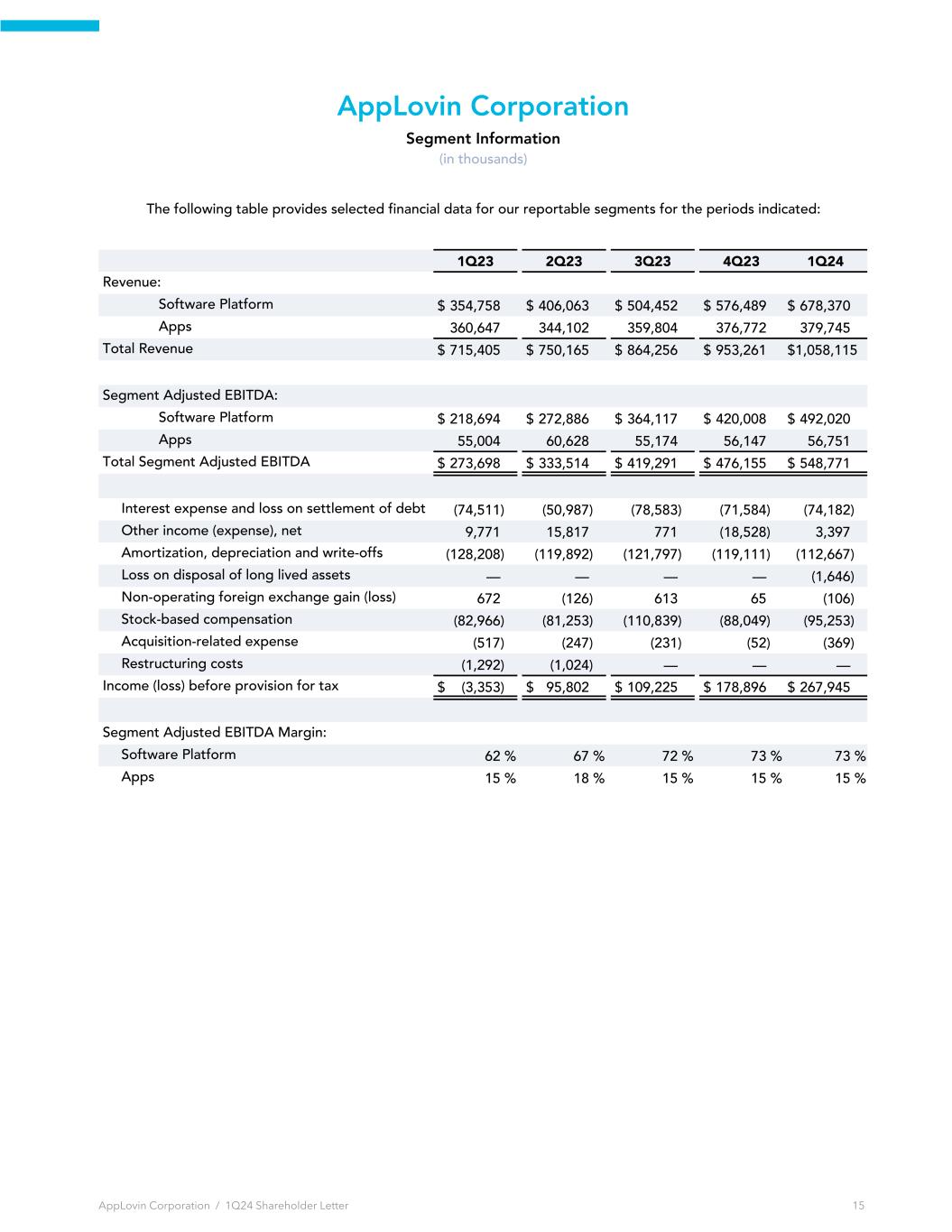AppLovin Corporation Segment Information (in thousands) The following table provides selected financial data for our reportable segments for the periods indicated: 1Q23 2Q23 3Q23 4Q23 1Q24 Revenue: Software Platform $ 354,758 $ 406,063 $ 504,452 $ 576,489 $ 678,370 Apps 360,647 344,102 359,804 376,772 379,745 Total Revenue $ 715,405 $ 750,165 $ 864,256 $ 953,261 $ 1,058,115 Segment Adjusted EBITDA: Software Platform $ 218,694 $ 272,886 $ 364,117 $ 420,008 $ 492,020 Apps 55,004 60,628 55,174 56,147 56,751 Total Segment Adjusted EBITDA $ 273,698 $ 333,514 $ 419,291 $ 476,155 $ 548,771 Interest expense and loss on settlement of debt (74,511) (50,987) (78,583) (71,584) (74,182) Other income (expense), net 9,771 15,817 771 (18,528) 3,397 Amortization, depreciation and write-offs (128,208) (119,892) (121,797) (119,111) (112,667) Loss on disposal of long lived assets — — — — (1,646) Non-operating foreign exchange gain (loss) 672 (126) 613 65 (106) Stock-based compensation (82,966) (81,253) (110,839) (88,049) (95,253) Acquisition-related expense (517) (247) (231) (52) (369) Restructuring costs (1,292) (1,024) — — — Income (loss) before provision for tax $ (3,353) $ 95,802 $ 109,225 $ 178,896 $ 267,945 Segment Adjusted EBITDA Margin: Software Platform 62 % 67 % 72 % 73 % 73 % Apps 15 % 18 % 15 % 15 % 15 % AppLovin Corporation / 1Q24 Shareholder Letter 15