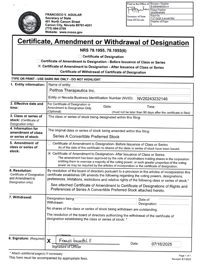 AGUILAR Nevada Secretary of State Document Number 20255045458 Description Amended Certification of Stock Designation After Issuance of Class/Series Number of Pages _3 FRANCISCO V. AGUILAR Secretary of State 401 North Carson Street Carson City, Nevada 89701-4201 (775) 684-5708 Website: www.nvsos.gov Filed in the Office of Secretary of State State Of Nevada Business Number E42848462024-4 Filing Number 20255045458 Filed On 7/17/2025 1:44:00 PM Number of Pages 3 Certificate, Amendment or Withdrawal of Designation NRS 78.1955, 78.1955(6) Certificate of Designation □ Certificate of Amendment to Designation - Before Issuance of Class or Series x Certificate of Amendment to Designation - After Issuance of Class or Series □ Certificate of Withdrawal of Certificate of Designation TYPE OR PRINT - USE DARK INK ONLY - DO NOT HIGHLIGHT 1. Entity information: Name of entity: Pelthos Therapeutics Inc. Entity or Nevada Business Identification Number (NVID): NV20243232146 2. Effective date and time: For Certificate of Designation or . Amendment to Designation Only Date. Time. (Optional): (must not be later than 90 days after the certificate is filed) 3. Class or series of stock: (Certificate of Designation only) The class or series of stock being designated within this filing: 4. Information for amendment of class or series of stock: The original class or series of stock being amended within this filing: Series A Convertible Preferred Stock 5. Amendment of class or series of stock: □ Certificate of Amendment to Designation- Before Issuance of Class or Series As of the date of this certificate no shares of the class or series of stock have been issued. \x\ Certificate of Amendment to Designation- After Issuance of Class or Series The amendment has been approved by the vote of stockholders holding shares in the corporation entitling them to exercise a majority of the voting power, or such greater proportion of the voting power as may be required by the articles of incorporation or the certificate of designation 6. Resolution: Certificate of Designation and Amendment to Designation only) By resolution of the board of directors pursuant to a provision in the articles of incorporation this certificate establishes OR amends the following regarding the voting powers, designations, preferences, limitations, restrictions and relative rights of the following class or series of stock.* See attached Certificate of Amendment to Certificate of Designations of Rights and Preferences of Series A Convertible Preferred Stock attached hereto. 7. Withdrawal: Designation being Date 0f Withdrawn: Desianation- No shares of the class or series of stock being withdrawn are outstanding. The resolution of the board of directors authorizing the withdrawal of the certificate of designation establishing the class or series of stock: * y Sinned bv: 8. Signature: (Required) X fWuxis kuWftl ll r, , CA E873951A6E5EA33 “ Date. 07/16/2025 Signature of Officer * Attach additional page(s) if necessary This form must be accompanied by appropriate fees. Page 1 of 1 Revised: 8/1/2023