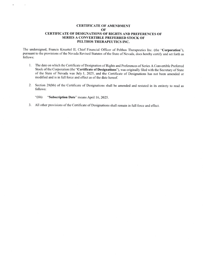 CERTIFICATE OF AMENDMENT OF CERTIFICATE OF DESIGNATIONS OF RIGHTS AND PREFERENCES OF SERIES A CONVERTIBLE PREFERRED STOCK OF PELTHOS THERAPEUTICS INC. The undersigned, Francis Knuettel II, Chief Financial Officer of Pelthos Therapeutics Inc. (the “Corporation”), pursuant to the provisions of the Nevada Revised Statutes of the State of Nevada, does hereby certify and set forth as follows: 1. The date on which the Certificate of Designation of Rights and Preferences of Series A Convertible Preferred Stock of the Corporation (the “Certificate of Designations”), was originally filed with the Secretary of State of the State of Nevada was July 1, 2025, and the Certificate of Designations has not been amended or modified and is in full force and effect as of the date hereof. 2. Section 28(bb) of the Certificate of Designations shall be amended and restated in its entirety to read as follows: “(bb) “Subscription Date” means April 16, 2025. 3. All other provisions of the Certificate of Designations shall remain in full force and effect.
