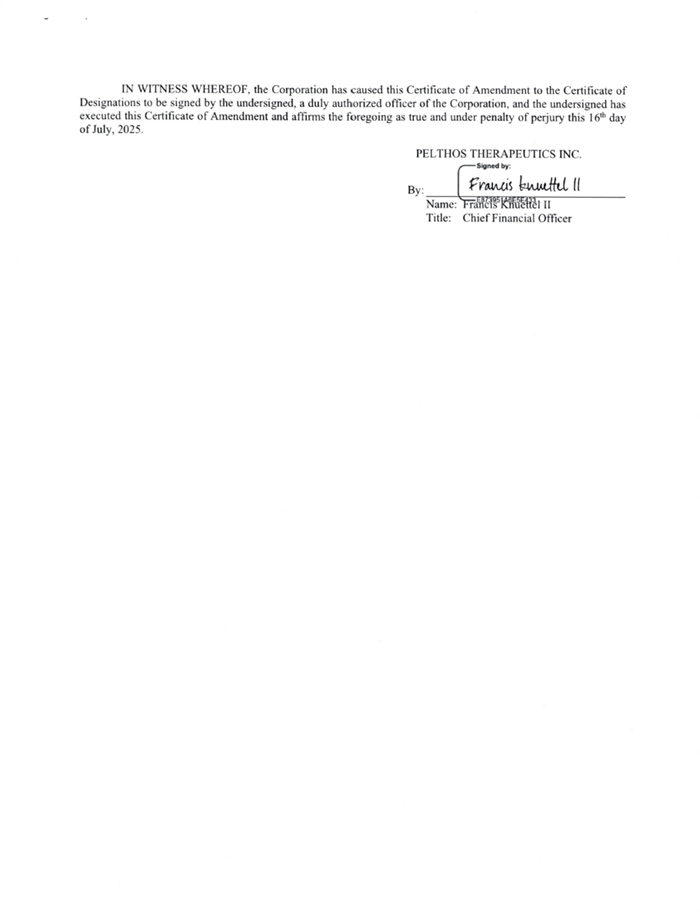IN WITNESS WHEREOF, the Corporation has caused this Certificate of Amendment to the Certificate of Designations to be signed by the undersigned, a duly authorized officer of the Corporation, and the undersigned has executed this Certificate of Amendment and affirms the foregoing as true and under penalty of perjury this 16th day of July, 2025. PELTHOS THERAPEUTICS INC. By:. Name: hrancis KJiuettel 11 Title: Chief Financial Officer