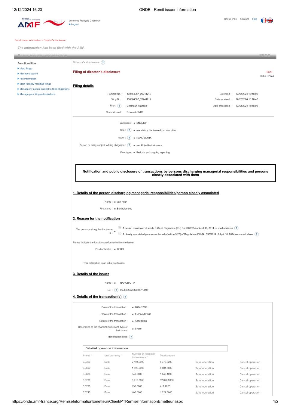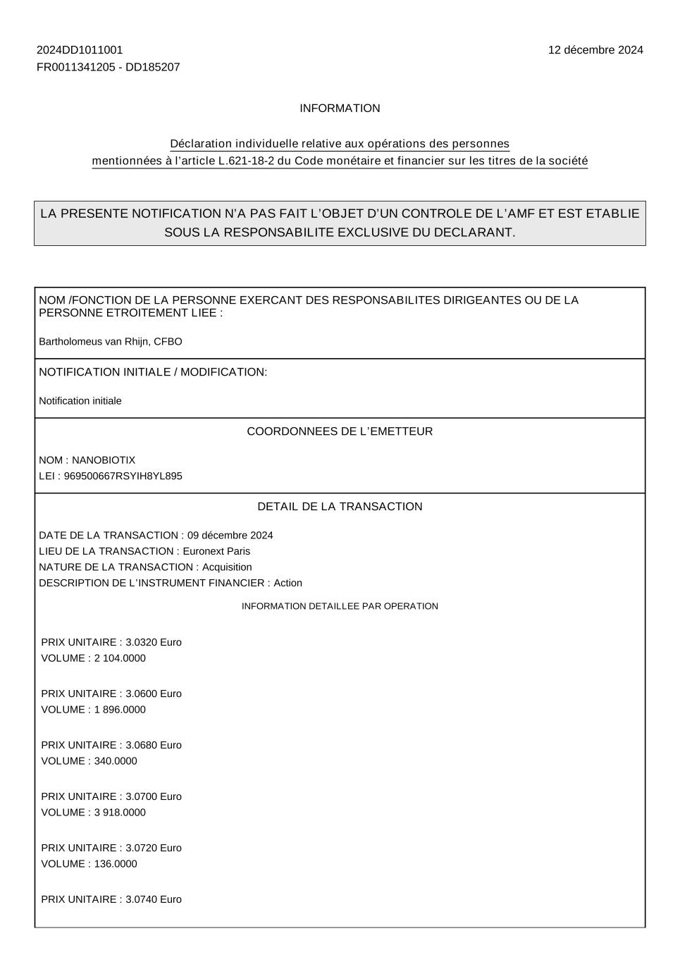On December 12, 2024, Nanobiotix SA (the “Registrant”) provided notification and public disclosure of transactions by persons discharging managerial responsibilities (“PDMR”) and persons closely associated with them in accordance with the requirements of the EU Market Abuse Regulation (“MAR”), which are attached hereto as Exhibit 99.1.