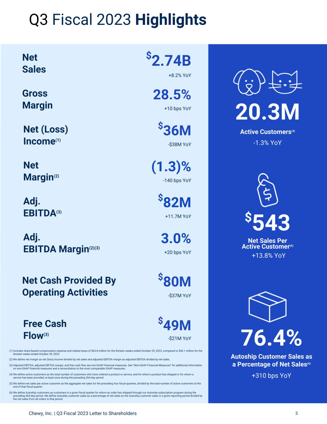 FINANCIAL & OPERATING DATA Chewy, Inc. | Q3 Fiscal 2023 Letter to Shareholders 7 13 Weeks Ended 39 Weeks Ended (in thousands, except net sales per active customer, per share data, and percentages) October 29, 2023 October 30, 2022 % Change October 29, 2023 October 30, 2022 % Change Financial and Operating Data Net sales $ 2,738,611 $ 2,532,122 8.2 % $ 8,301,055 $ 7,391,460 12.3 % Net (loss) income (1) $ (35,810) $ 2,311 n/m $ 5,317 $ 43,128 (87.7) % Net margin (2) (1.3) % 0.1 % 0.1 % 0.6 % Adjusted EBITDA (3) $ 82,126 $ 70,399 16.7 % $ 279,167 $ 213,970 30.5 % Adjusted EBITDA margin (2)(3) 3.0 % 2.8 % 3.4 % 2.9 % Adjusted net income (3) $ 63,011 $ 48,401 30.2 % $ 213,576 $ 156,151 36.8 % (Loss) earnings per share, basic and diluted (1) $ (0.08) $ 0.01 n/m $ 0.01 $ 0.10 (90.0) % Adjusted earnings per share, basic and diluted (3) $ 0.15 $ 0.11 36.4 % $ 0.50 $ 0.37 35.1 % Net cash provided by operating activities $ 80,208 $ 117,415 (31.7) % $ 387,356 $ 249,020 55.6 % Free cash flow (3) $ 48,523 $ 69,786 (30.5) % $ 276,458 $ 77,179 258.2 % Active customers (4) 20,266 20,524 (1.3) % 20,266 20,524 (1.3) % Net sales per active customer (5) $ 543 $ 477 13.8 % $ 543 $ 477 13.8 % Autoship customer sales (6) $ 2,093,077 $ 1,855,979 12.8 % $ 6,270,985 $ 5,386,243 16.4 % Autoship customer sales as a percentage of net sales (6) 76.4 % 73.3 % 75.5 % 72.9 % n/m - not meaningful (1) Includes share-based compensation expense and related taxes of $65.8 million and $187.9 million for the thirteen and thirty- nine weeks ended October 29, 2023, compared to $46.1 million and $113.0 million for the thirteen and thirty-nine weeks ended October 30, 2022. (2) We define net margin as net (loss) income divided by net sales and adjusted EBITDA margin as adjusted EBITDA divided by net sales. (3) Adjusted EBITDA, adjusted EBITDA margin, adjusted net income, adjusted basic and diluted earnings per share, and free cash flow are non-GAAP financial measures. See “Non-GAAP Financial Measures” for additional information on non-GAAP financial measures and a reconciliation to the most comparable GAAP measures. (4) We define active customers as the total number of customers who have ordered a product or service, and for whom a product has shipped or for whom a service has been provided, at least once during the preceding 364-day period. (5) We define net sales per active customer as the aggregate net sales for the preceding four fiscal quarters, divided by the total number of active customers at the end of that fiscal quarter. (6) We define Autoship customers as customers in a given fiscal quarter for whom an order has shipped through our Autoship subscription program during the preceding 364-day period. We define Autoship customer sales as a percentage of net sales as the Autoship customer sales in a given reporting period divided by the net sales from all orders in that period.