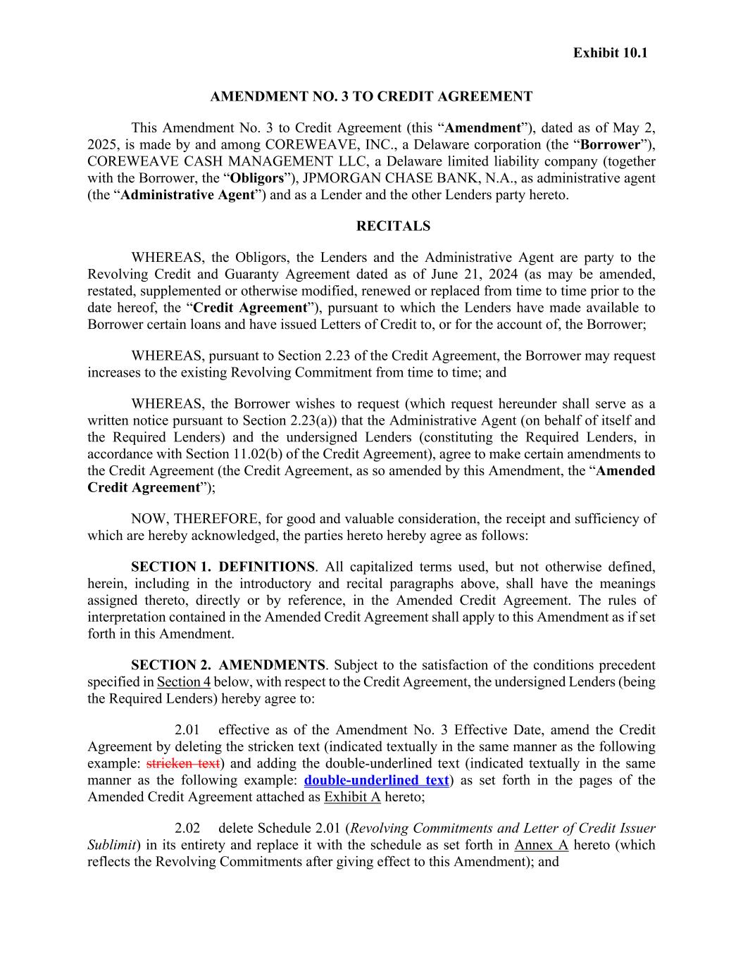 Exhibit 10.1 AMENDMENT NO. 3 TO CREDIT AGREEMENT This Amendment No. 3 to Credit Agreement (this “Amendment”), dated as of May 2, 2025, is made by and among COREWEAVE, INC., a Delaware corporation (the “Borrower”), COREWEAVE CASH MANAGEMENT LLC, a Delaware limited liability company (together with the Borrower, the “Obligors”), JPMORGAN CHASE BANK, N.A., as administrative agent (the “Administrative Agent”) and as a Lender and the other Lenders party hereto. RECITALS WHEREAS, the Obligors, the Lenders and the Administrative Agent are party to the Revolving Credit and Guaranty Agreement dated as of June 21, 2024 (as may be amended, restated, supplemented or otherwise modified, renewed or replaced from time to time prior to the date hereof, the “Credit Agreement”), pursuant to which the Lenders have made available to Borrower certain loans and have issued Letters of Credit to, or for the account of, the Borrower; WHEREAS, pursuant to Section 2.23 of the Credit Agreement, the Borrower may request increases to the existing Revolving Commitment from time to time; and WHEREAS, the Borrower wishes to request (which request hereunder shall serve as a written notice pursuant to Section 2.23(a)) that the Administrative Agent (on behalf of itself and the Required Lenders) and the undersigned Lenders (constituting the Required Lenders, in accordance with Section 11.02(b) of the Credit Agreement), agree to make certain amendments to the Credit Agreement (the Credit Agreement, as so amended by this Amendment, the “Amended Credit Agreement”); NOW, THEREFORE, for good and valuable consideration, the receipt and sufficiency of which are hereby acknowledged, the parties hereto hereby agree as follows: SECTION 1. DEFINITIONS. All capitalized terms used, but not otherwise defined, herein, including in the introductory and recital paragraphs above, shall have the meanings assigned thereto, directly or by reference, in the Amended Credit Agreement. The rules of interpretation contained in the Amended Credit Agreement shall apply to this Amendment as if set forth in this Amendment. SECTION 2. AMENDMENTS. Subject to the satisfaction of the conditions precedent specified in Section 4 below, with respect to the Credit Agreement, the undersigned Lenders (being the Required Lenders) hereby agree to: 2.01 effective as of the Amendment No. 3 Effective Date, amend the Credit Agreement by deleting the stricken text (indicated textually in the same manner as the following example: stricken text) and adding the double-underlined text (indicated textually in the same manner as the following example: double-underlined text) as set forth in the pages of the Amended Credit Agreement attached as Exhibit A hereto; 2.02 delete Schedule 2.01 (Revolving Commitments and Letter of Credit Issuer Sublimit) in its entirety and replace it with the schedule as set forth in Annex A hereto (which reflects the Revolving Commitments after giving effect to this Amendment); and