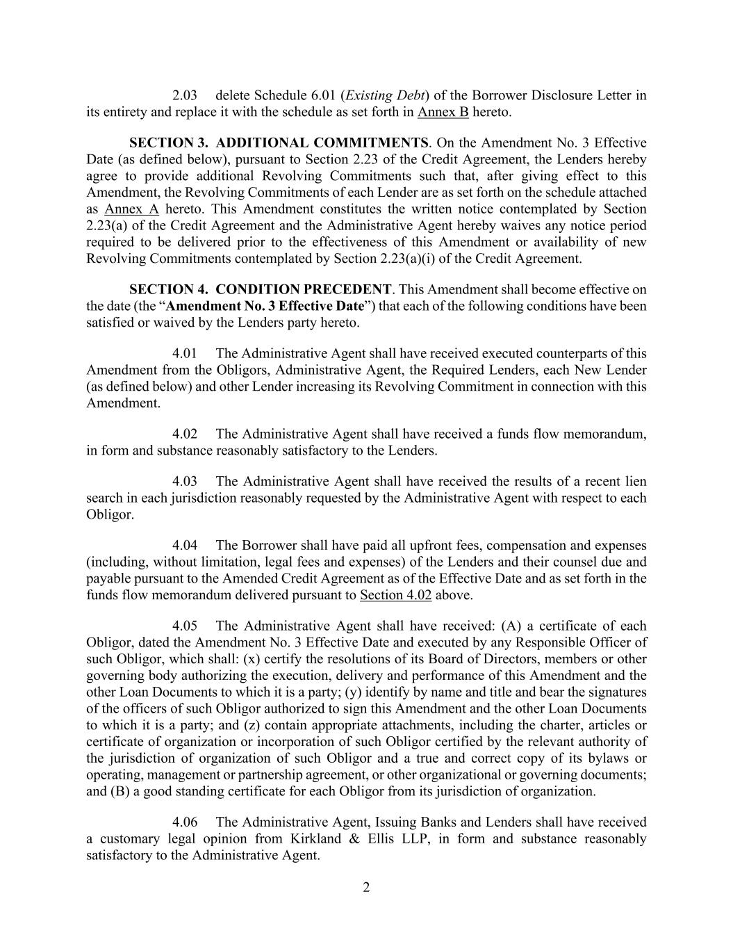 2 2.03 delete Schedule 6.01 (Existing Debt) of the Borrower Disclosure Letter in its entirety and replace it with the schedule as set forth in Annex B hereto. SECTION 3. ADDITIONAL COMMITMENTS. On the Amendment No. 3 Effective Date (as defined below), pursuant to Section 2.23 of the Credit Agreement, the Lenders hereby agree to provide additional Revolving Commitments such that, after giving effect to this Amendment, the Revolving Commitments of each Lender are as set forth on the schedule attached as Annex A hereto. This Amendment constitutes the written notice contemplated by Section 2.23(a) of the Credit Agreement and the Administrative Agent hereby waives any notice period required to be delivered prior to the effectiveness of this Amendment or availability of new Revolving Commitments contemplated by Section 2.23(a)(i) of the Credit Agreement. SECTION 4. CONDITION PRECEDENT. This Amendment shall become effective on the date (the “Amendment No. 3 Effective Date”) that each of the following conditions have been satisfied or waived by the Lenders party hereto. 4.01 The Administrative Agent shall have received executed counterparts of this Amendment from the Obligors, Administrative Agent, the Required Lenders, each New Lender (as defined below) and other Lender increasing its Revolving Commitment in connection with this Amendment. 4.02 The Administrative Agent shall have received a funds flow memorandum, in form and substance reasonably satisfactory to the Lenders. 4.03 The Administrative Agent shall have received the results of a recent lien search in each jurisdiction reasonably requested by the Administrative Agent with respect to each Obligor. 4.04 The Borrower shall have paid all upfront fees, compensation and expenses (including, without limitation, legal fees and expenses) of the Lenders and their counsel due and payable pursuant to the Amended Credit Agreement as of the Effective Date and as set forth in the funds flow memorandum delivered pursuant to Section 4.02 above. 4.05 The Administrative Agent shall have received: (A) a certificate of each Obligor, dated the Amendment No. 3 Effective Date and executed by any Responsible Officer of such Obligor, which shall: (x) certify the resolutions of its Board of Directors, members or other governing body authorizing the execution, delivery and performance of this Amendment and the other Loan Documents to which it is a party; (y) identify by name and title and bear the signatures of the officers of such Obligor authorized to sign this Amendment and the other Loan Documents to which it is a party; and (z) contain appropriate attachments, including the charter, articles or certificate of organization or incorporation of such Obligor certified by the relevant authority of the jurisdiction of organization of such Obligor and a true and correct copy of its bylaws or operating, management or partnership agreement, or other organizational or governing documents; and (B) a good standing certificate for each Obligor from its jurisdiction of organization. 4.06 The Administrative Agent, Issuing Banks and Lenders shall have received a customary legal opinion from Kirkland & Ellis LLP, in form and substance reasonably satisfactory to the Administrative Agent.