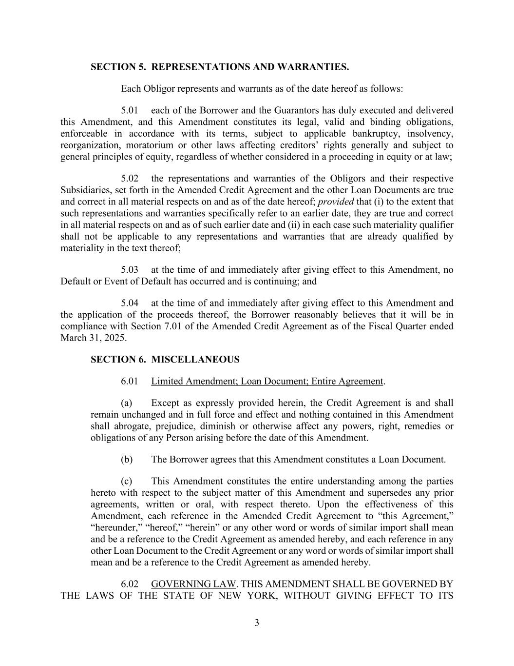 3 SECTION 5. REPRESENTATIONS AND WARRANTIES. Each Obligor represents and warrants as of the date hereof as follows: 5.01 each of the Borrower and the Guarantors has duly executed and delivered this Amendment, and this Amendment constitutes its legal, valid and binding obligations, enforceable in accordance with its terms, subject to applicable bankruptcy, insolvency, reorganization, moratorium or other laws affecting creditors’ rights generally and subject to general principles of equity, regardless of whether considered in a proceeding in equity or at law; 5.02 the representations and warranties of the Obligors and their respective Subsidiaries, set forth in the Amended Credit Agreement and the other Loan Documents are true and correct in all material respects on and as of the date hereof; provided that (i) to the extent that such representations and warranties specifically refer to an earlier date, they are true and correct in all material respects on and as of such earlier date and (ii) in each case such materiality qualifier shall not be applicable to any representations and warranties that are already qualified by materiality in the text thereof; 5.03 at the time of and immediately after giving effect to this Amendment, no Default or Event of Default has occurred and is continuing; and 5.04 at the time of and immediately after giving effect to this Amendment and the application of the proceeds thereof, the Borrower reasonably believes that it will be in compliance with Section 7.01 of the Amended Credit Agreement as of the Fiscal Quarter ended March 31, 2025. SECTION 6. MISCELLANEOUS 6.01 Limited Amendment; Loan Document; Entire Agreement. (a) Except as expressly provided herein, the Credit Agreement is and shall remain unchanged and in full force and effect and nothing contained in this Amendment shall abrogate, prejudice, diminish or otherwise affect any powers, right, remedies or obligations of any Person arising before the date of this Amendment. (b) The Borrower agrees that this Amendment constitutes a Loan Document. (c) This Amendment constitutes the entire understanding among the parties hereto with respect to the subject matter of this Amendment and supersedes any prior agreements, written or oral, with respect thereto. Upon the effectiveness of this Amendment, each reference in the Amended Credit Agreement to “this Agreement,” “hereunder,” “hereof,” “herein” or any other word or words of similar import shall mean and be a reference to the Credit Agreement as amended hereby, and each reference in any other Loan Document to the Credit Agreement or any word or words of similar import shall mean and be a reference to the Credit Agreement as amended hereby. 6.02 GOVERNING LAW. THIS AMENDMENT SHALL BE GOVERNED BY THE LAWS OF THE STATE OF NEW YORK, WITHOUT GIVING EFFECT TO ITS