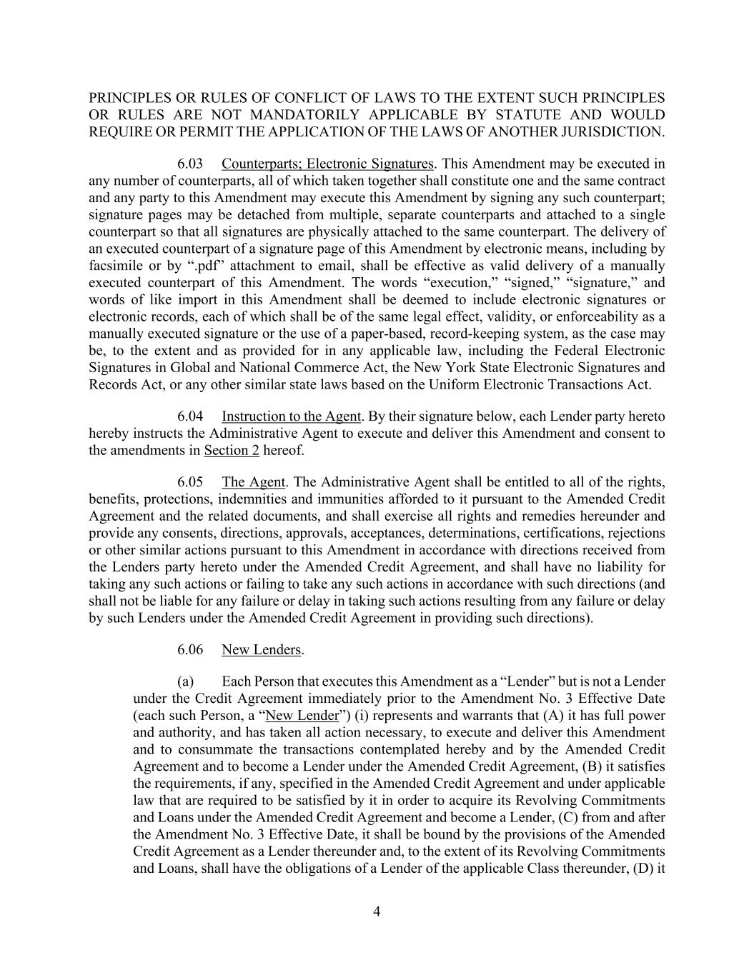 4 PRINCIPLES OR RULES OF CONFLICT OF LAWS TO THE EXTENT SUCH PRINCIPLES OR RULES ARE NOT MANDATORILY APPLICABLE BY STATUTE AND WOULD REQUIRE OR PERMIT THE APPLICATION OF THE LAWS OF ANOTHER JURISDICTION. 6.03 Counterparts; Electronic Signatures. This Amendment may be executed in any number of counterparts, all of which taken together shall constitute one and the same contract and any party to this Amendment may execute this Amendment by signing any such counterpart; signature pages may be detached from multiple, separate counterparts and attached to a single counterpart so that all signatures are physically attached to the same counterpart. The delivery of an executed counterpart of a signature page of this Amendment by electronic means, including by facsimile or by “.pdf” attachment to email, shall be effective as valid delivery of a manually executed counterpart of this Amendment. The words “execution,” “signed,” “signature,” and words of like import in this Amendment shall be deemed to include electronic signatures or electronic records, each of which shall be of the same legal effect, validity, or enforceability as a manually executed signature or the use of a paper-based, record-keeping system, as the case may be, to the extent and as provided for in any applicable law, including the Federal Electronic Signatures in Global and National Commerce Act, the New York State Electronic Signatures and Records Act, or any other similar state laws based on the Uniform Electronic Transactions Act. 6.04 Instruction to the Agent. By their signature below, each Lender party hereto hereby instructs the Administrative Agent to execute and deliver this Amendment and consent to the amendments in Section 2 hereof. 6.05 The Agent. The Administrative Agent shall be entitled to all of the rights, benefits, protections, indemnities and immunities afforded to it pursuant to the Amended Credit Agreement and the related documents, and shall exercise all rights and remedies hereunder and provide any consents, directions, approvals, acceptances, determinations, certifications, rejections or other similar actions pursuant to this Amendment in accordance with directions received from the Lenders party hereto under the Amended Credit Agreement, and shall have no liability for taking any such actions or failing to take any such actions in accordance with such directions (and shall not be liable for any failure or delay in taking such actions resulting from any failure or delay by such Lenders under the Amended Credit Agreement in providing such directions). 6.06 New Lenders. (a) Each Person that executes this Amendment as a “Lender” but is not a Lender under the Credit Agreement immediately prior to the Amendment No. 3 Effective Date (each such Person, a “New Lender”) (i) represents and warrants that (A) it has full power and authority, and has taken all action necessary, to execute and deliver this Amendment and to consummate the transactions contemplated hereby and by the Amended Credit Agreement and to become a Lender under the Amended Credit Agreement, (B) it satisfies the requirements, if any, specified in the Amended Credit Agreement and under applicable law that are required to be satisfied by it in order to acquire its Revolving Commitments and Loans under the Amended Credit Agreement and become a Lender, (C) from and after the Amendment No. 3 Effective Date, it shall be bound by the provisions of the Amended Credit Agreement as a Lender thereunder and, to the extent of its Revolving Commitments and Loans, shall have the obligations of a Lender of the applicable Class thereunder, (D) it