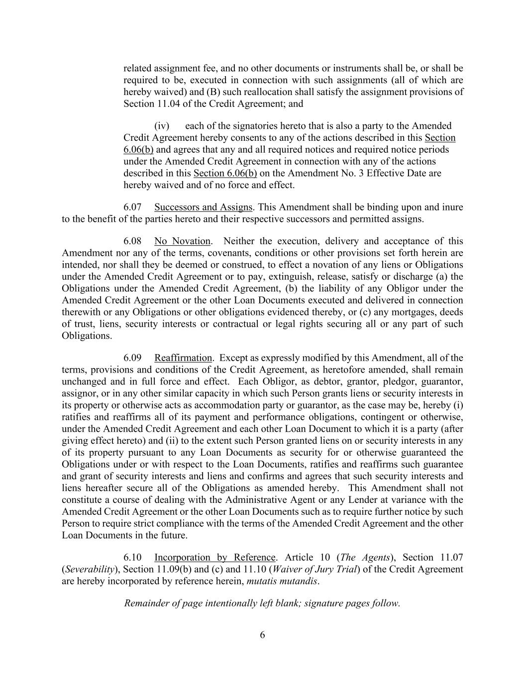 6 related assignment fee, and no other documents or instruments shall be, or shall be required to be, executed in connection with such assignments (all of which are hereby waived) and (B) such reallocation shall satisfy the assignment provisions of Section 11.04 of the Credit Agreement; and (iv) each of the signatories hereto that is also a party to the Amended Credit Agreement hereby consents to any of the actions described in this Section 6.06(b) and agrees that any and all required notices and required notice periods under the Amended Credit Agreement in connection with any of the actions described in this Section 6.06(b) on the Amendment No. 3 Effective Date are hereby waived and of no force and effect. 6.07 Successors and Assigns. This Amendment shall be binding upon and inure to the benefit of the parties hereto and their respective successors and permitted assigns. 6.08 No Novation. Neither the execution, delivery and acceptance of this Amendment nor any of the terms, covenants, conditions or other provisions set forth herein are intended, nor shall they be deemed or construed, to effect a novation of any liens or Obligations under the Amended Credit Agreement or to pay, extinguish, release, satisfy or discharge (a) the Obligations under the Amended Credit Agreement, (b) the liability of any Obligor under the Amended Credit Agreement or the other Loan Documents executed and delivered in connection therewith or any Obligations or other obligations evidenced thereby, or (c) any mortgages, deeds of trust, liens, security interests or contractual or legal rights securing all or any part of such Obligations. 6.09 Reaffirmation. Except as expressly modified by this Amendment, all of the terms, provisions and conditions of the Credit Agreement, as heretofore amended, shall remain unchanged and in full force and effect. Each Obligor, as debtor, grantor, pledgor, guarantor, assignor, or in any other similar capacity in which such Person grants liens or security interests in its property or otherwise acts as accommodation party or guarantor, as the case may be, hereby (i) ratifies and reaffirms all of its payment and performance obligations, contingent or otherwise, under the Amended Credit Agreement and each other Loan Document to which it is a party (after giving effect hereto) and (ii) to the extent such Person granted liens on or security interests in any of its property pursuant to any Loan Documents as security for or otherwise guaranteed the Obligations under or with respect to the Loan Documents, ratifies and reaffirms such guarantee and grant of security interests and liens and confirms and agrees that such security interests and liens hereafter secure all of the Obligations as amended hereby. This Amendment shall not constitute a course of dealing with the Administrative Agent or any Lender at variance with the Amended Credit Agreement or the other Loan Documents such as to require further notice by such Person to require strict compliance with the terms of the Amended Credit Agreement and the other Loan Documents in the future. 6.10 Incorporation by Reference. Article 10 (The Agents), Section 11.07 (Severability), Section 11.09(b) and (c) and 11.10 (Waiver of Jury Trial) of the Credit Agreement are hereby incorporated by reference herein, mutatis mutandis. Remainder of page intentionally left blank; signature pages follow.