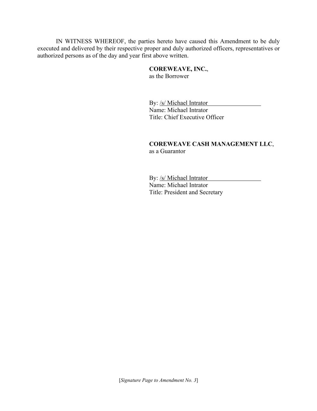[Signature Page to Amendment No. 3] IN WITNESS WHEREOF, the parties hereto have caused this Amendment to be duly executed and delivered by their respective proper and duly authorized officers, representatives or authorized persons as of the day and year first above written. COREWEAVE, INC., as the Borrower By: /s/ Michael Intrator Name: Michael Intrator Title: Chief Executive Officer COREWEAVE CASH MANAGEMENT LLC, as a Guarantor By: /s/ Michael Intrator Name: Michael Intrator Title: President and Secretary