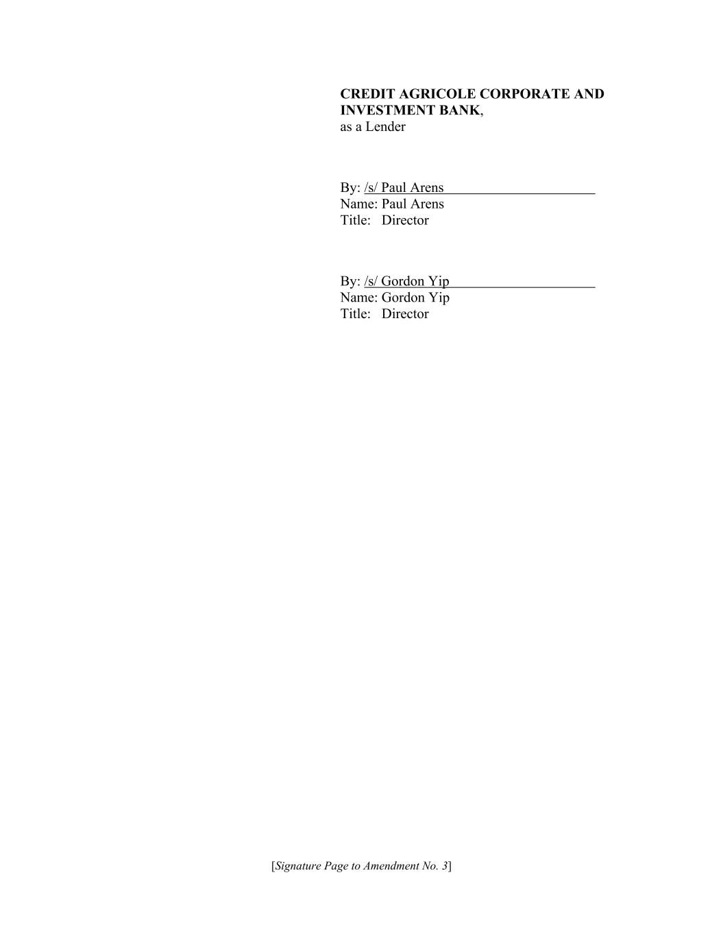 [Signature Page to Amendment No. 3] CREDIT AGRICOLE CORPORATE AND INVESTMENT BANK, as a Lender By: /s/ Paul Arens Name: Paul Arens Title: Director By: /s/ Gordon Yip Name: Gordon Yip Title: Director