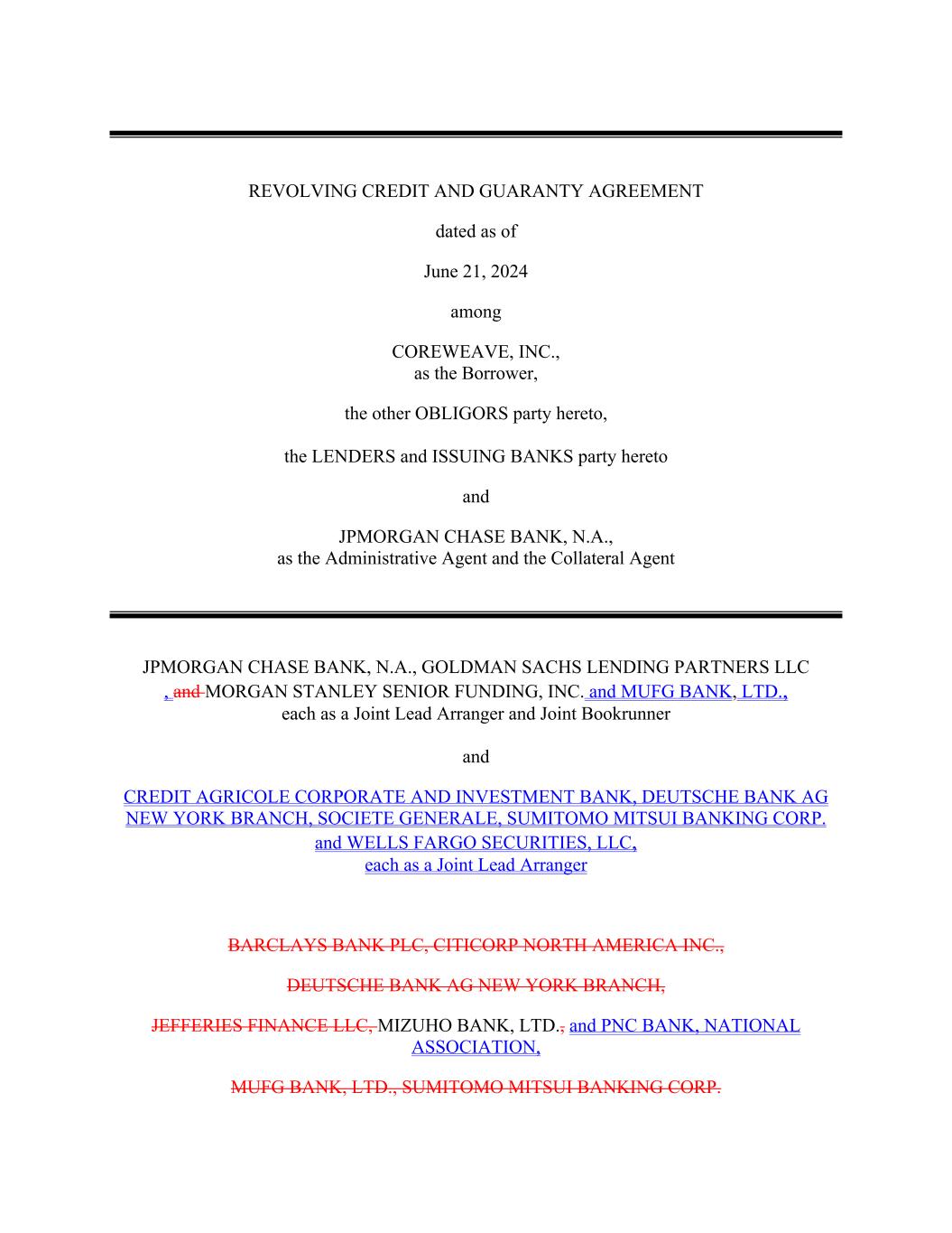 REVOLVING CREDIT AND GUARANTY AGREEMENT dated as of June 21, 2024 among COREWEAVE, INC., as the Borrower, the other OBLIGORS party hereto, the LENDERS and ISSUING BANKS party hereto and JPMORGAN CHASE BANK, N.A., as the Administrative Agent and the Collateral Agent JPMORGAN CHASE BANK, N.A., GOLDMAN SACHS LENDING PARTNERS LLC , and MORGAN STANLEY SENIOR FUNDING, INC. and MUFG BANK, LTD., each as a Joint Lead Arranger and Joint Bookrunner and CREDIT AGRICOLE CORPORATE AND INVESTMENT BANK, DEUTSCHE BANK AG NEW YORK BRANCH, SOCIETE GENERALE, SUMITOMO MITSUI BANKING CORP. and WELLS FARGO SECURITIES, LLC, each as a Joint Lead Arranger BARCLAYS BANK PLC, CITICORP NORTH AMERICA INC., DEUTSCHE BANK AG NEW YORK BRANCH, JEFFERIES FINANCE LLC, MIZUHO BANK, LTD., and PNC BANK, NATIONAL ASSOCIATION, MUFG BANK, LTD., SUMITOMO MITSUI BANKING CORP.