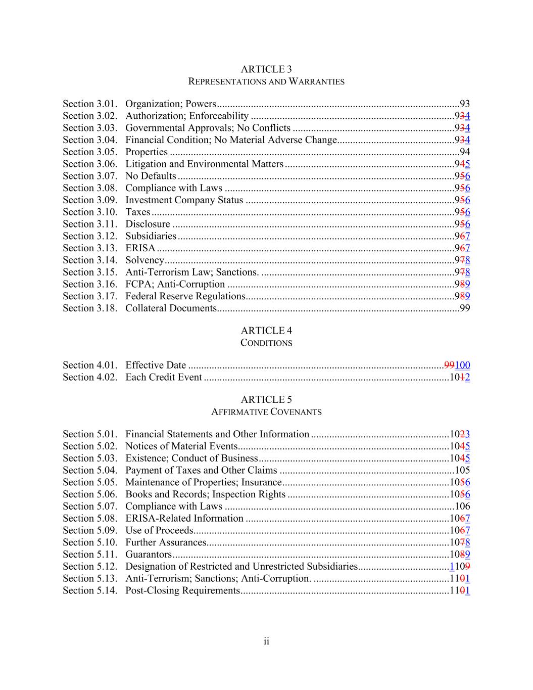 ii ARTICLE 3 REPRESENTATIONS AND WARRANTIES Section 3.01. Organization; Powers.............................................................................................93 Section 3.02. Authorization; Enforceability ..............................................................................934 Section 3.03. Governmental Approvals; No Conflicts ..............................................................934 Section 3.04. Financial Condition; No Material Adverse Change.............................................934 Section 3.05. Properties ...............................................................................................................94 Section 3.06. Litigation and Environmental Matters .................................................................945 Section 3.07. No Defaults ..........................................................................................................956 Section 3.08. Compliance with Laws ........................................................................................956 Section 3.09. Investment Company Status ................................................................................956 Section 3.10. Taxes ....................................................................................................................956 Section 3.11. Disclosure ............................................................................................................956 Section 3.12. Subsidiaries ..........................................................................................................967 Section 3.13. ERISA..................................................................................................................967 Section 3.14. Solvency...............................................................................................................978 Section 3.15. Anti-Terrorism Law; Sanctions. ..........................................................................978 Section 3.16. FCPA; Anti-Corruption .......................................................................................989 Section 3.17. Federal Reserve Regulations................................................................................989 Section 3.18. Collateral Documents.............................................................................................99 ARTICLE 4 CONDITIONS Section 4.01. Effective Date ..................................................................................................99100 Section 4.02. Each Credit Event ..............................................................................................1012 ARTICLE 5 AFFIRMATIVE COVENANTS Section 5.01. Financial Statements and Other Information .....................................................1023 Section 5.02. Notices of Material Events.................................................................................1045 Section 5.03. Existence; Conduct of Business.........................................................................1045 Section 5.04. Payment of Taxes and Other Claims ...................................................................105 Section 5.05. Maintenance of Properties; Insurance................................................................1056 Section 5.06. Books and Records; Inspection Rights ..............................................................1056 Section 5.07. Compliance with Laws ........................................................................................106 Section 5.08. ERISA-Related Information ..............................................................................1067 Section 5.09. Use of Proceeds..................................................................................................1067 Section 5.10. Further Assurances.............................................................................................1078 Section 5.11. Guarantors..........................................................................................................1089 Section 5.12. Designation of Restricted and Unrestricted Subsidiaries...................................1109 Section 5.13. Anti-Terrorism; Sanctions; Anti-Corruption. ....................................................1101 Section 5.14. Post-Closing Requirements................................................................................1101