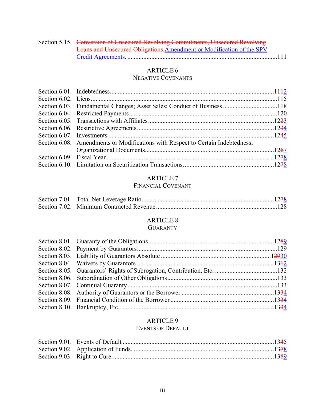 iii Section 5.15. Conversion of Unsecured Revolving Commitments, Unsecured Revolving Loans and Unsecured Obligations.Amendment or Modification of the SPV Credit Agreements. ..............................................................................................111 ARTICLE 6 NEGATIVE COVENANTS Section 6.01. Indebtedness.......................................................................................................1112 Section 6.02. Liens.....................................................................................................................115 Section 6.03. Fundamental Changes; Asset Sales; Conduct of Business ..................................118 Section 6.04. Restricted Payments.............................................................................................120 Section 6.05. Transactions with Affiliates...............................................................................1223 Section 6.06. Restrictive Agreements......................................................................................1234 Section 6.07. Investments ........................................................................................................1245 Section 6.08. Amendments or Modifications with Respect to Certain Indebtedness; Organizational Documents.................................................................................1267 Section 6.09. Fiscal Year .........................................................................................................1278 Section 6.10. Limitation on Securitization Transactions. ........................................................1278 ARTICLE 7 FINANCIAL COVENANT Section 7.01. Total Net Leverage Ratio...................................................................................1278 Section 7.02. Minimum Contracted Revenue ............................................................................128 ARTICLE 8 GUARANTY Section 8.01. Guaranty of the Obligations...............................................................................1289 Section 8.02. Payment by Guarantors........................................................................................129 Section 8.03. Liability of Guarantors Absolute .....................................................................12930 Section 8.04. Waivers by Guarantors ......................................................................................1312 Section 8.05. Guarantors’ Rights of Subrogation, Contribution, Etc. .......................................132 Section 8.06. Subordination of Other Obligations.....................................................................133 Section 8.07. Continual Guaranty..............................................................................................133 Section 8.08. Authority of Guarantors or the Borrower ..........................................................1334 Section 8.09. Financial Condition of the Borrower .................................................................1334 Section 8.10. Bankruptcy, Etc..................................................................................................1334 ARTICLE 9 EVENTS OF DEFAULT Section 9.01. Events of Default ...............................................................................................1345 Section 9.02. Application of Funds..........................................................................................1378 Section 9.03. Right to Cure......................................................................................................1389