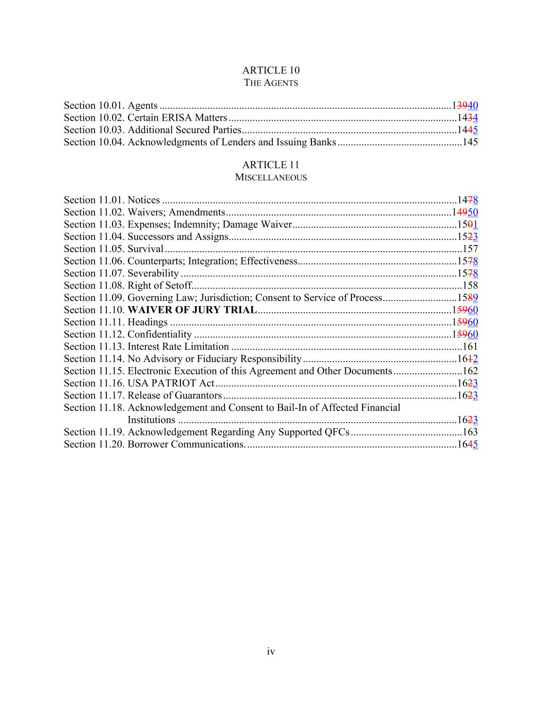 iv ARTICLE 10 THE AGENTS Section 10.01. Agents ..............................................................................................................13940 Section 10.02. Certain ERISA Matters ......................................................................................1434 Section 10.03. Additional Secured Parties.................................................................................1445 Section 10.04. Acknowledgments of Lenders and Issuing Banks ...............................................145 ARTICLE 11 MISCELLANEOUS Section 11.01. Notices ...............................................................................................................1478 Section 11.02. Waivers; Amendments.....................................................................................14950 Section 11.03. Expenses; Indemnity; Damage Waiver..............................................................1501 Section 11.04. Successors and Assigns......................................................................................1523 Section 11.05. Survival ................................................................................................................157 Section 11.06. Counterparts; Integration; Effectiveness............................................................1578 Section 11.07. Severability ........................................................................................................1578 Section 11.08. Right of Setoff......................................................................................................158 Section 11.09. Governing Law; Jurisdiction; Consent to Service of Process............................1589 Section 11.10. WAIVER OF JURY TRIAL.........................................................................15960 Section 11.11. Headings ..........................................................................................................15960 Section 11.12. Confidentiality .................................................................................................15960 Section 11.13. Interest Rate Limitation .......................................................................................161 Section 11.14. No Advisory or Fiduciary Responsibility ..........................................................1612 Section 11.15. Electronic Execution of this Agreement and Other Documents..........................162 Section 11.16. USA PATRIOT Act...........................................................................................1623 Section 11.17. Release of Guarantors ........................................................................................1623 Section 11.18. Acknowledgement and Consent to Bail-In of Affected Financial Institutions .........................................................................................................1623 Section 11.19. Acknowledgement Regarding Any Supported QFCs ..........................................163 Section 11.20. Borrower Communications................................................................................1645