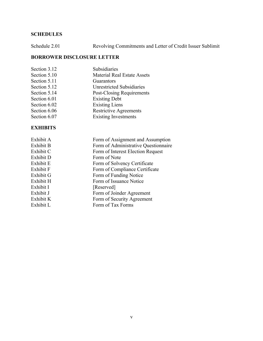 v SCHEDULES Schedule 2.01 Revolving Commitments and Letter of Credit Issuer Sublimit BORROWER DISCLOSURE LETTER Section 3.12 Subsidiaries Section 5.10 Material Real Estate Assets Section 5.11 Guarantors Section 5.12 Unrestricted Subsidiaries Section 5.14 Post-Closing Requirements Section 6.01 Existing Debt Section 6.02 Existing Liens Section 6.06 Restrictive Agreements Section 6.07 Existing Investments EXHIBITS Exhibit A Form of Assignment and Assumption Exhibit B Form of Administrative Questionnaire Exhibit C Form of Interest Election Request Exhibit D Form of Note Exhibit E Form of Solvency Certificate Exhibit F Form of Compliance Certificate Exhibit G Form of Funding Notice Exhibit H Form of Issuance Notice Exhibit I [Reserved] Exhibit J Form of Joinder Agreement Exhibit K Form of Security Agreement Exhibit L Form of Tax Forms