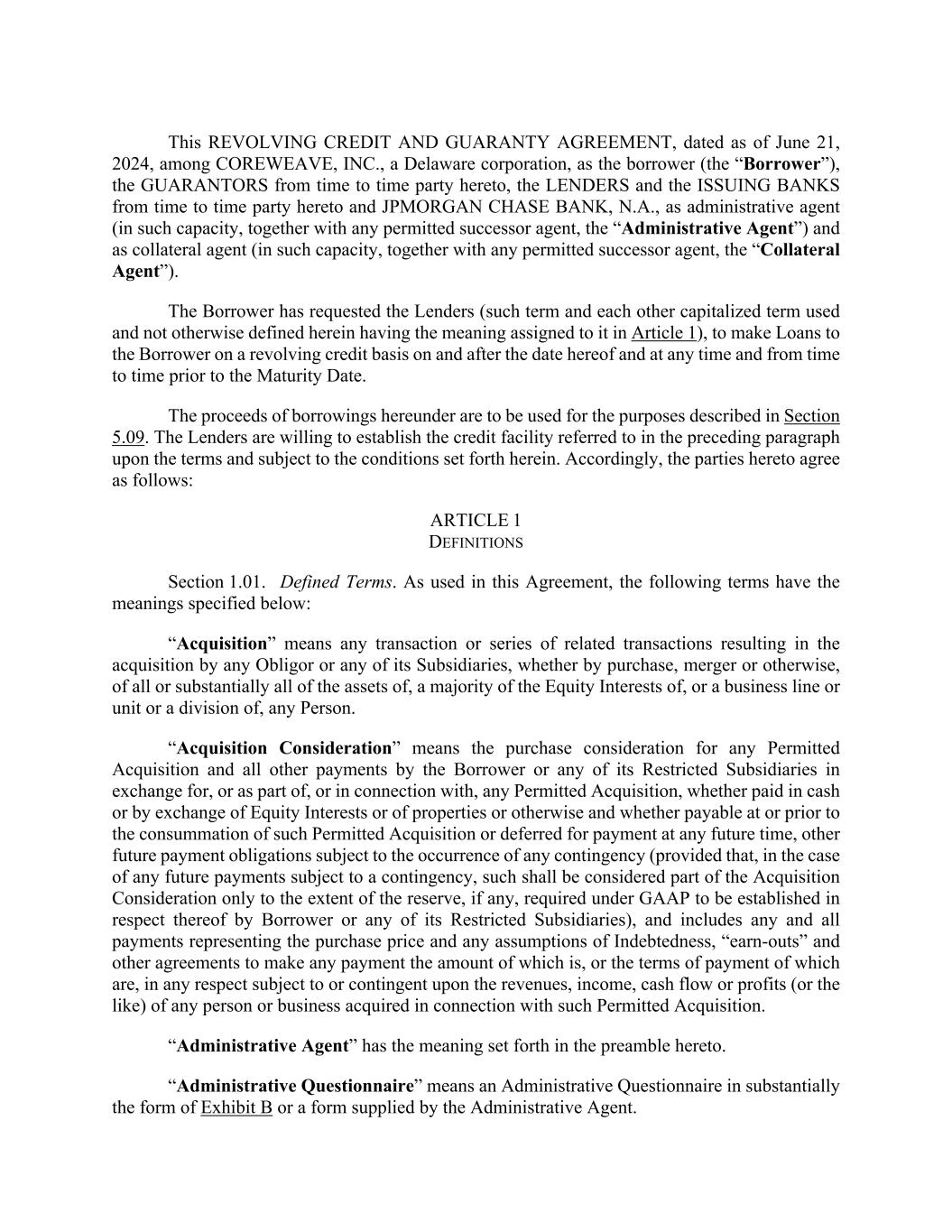This REVOLVING CREDIT AND GUARANTY AGREEMENT, dated as of June 21, 2024, among COREWEAVE, INC., a Delaware corporation, as the borrower (the “Borrower”), the GUARANTORS from time to time party hereto, the LENDERS and the ISSUING BANKS from time to time party hereto and JPMORGAN CHASE BANK, N.A., as administrative agent (in such capacity, together with any permitted successor agent, the “Administrative Agent”) and as collateral agent (in such capacity, together with any permitted successor agent, the “Collateral Agent”). The Borrower has requested the Lenders (such term and each other capitalized term used and not otherwise defined herein having the meaning assigned to it in Article 1), to make Loans to the Borrower on a revolving credit basis on and after the date hereof and at any time and from time to time prior to the Maturity Date. The proceeds of borrowings hereunder are to be used for the purposes described in Section 5.09. The Lenders are willing to establish the credit facility referred to in the preceding paragraph upon the terms and subject to the conditions set forth herein. Accordingly, the parties hereto agree as follows: ARTICLE 1 DEFINITIONS Section 1.01. Defined Terms. As used in this Agreement, the following terms have the meanings specified below: “Acquisition” means any transaction or series of related transactions resulting in the acquisition by any Obligor or any of its Subsidiaries, whether by purchase, merger or otherwise, of all or substantially all of the assets of, a majority of the Equity Interests of, or a business line or unit or a division of, any Person. “Acquisition Consideration” means the purchase consideration for any Permitted Acquisition and all other payments by the Borrower or any of its Restricted Subsidiaries in exchange for, or as part of, or in connection with, any Permitted Acquisition, whether paid in cash or by exchange of Equity Interests or of properties or otherwise and whether payable at or prior to the consummation of such Permitted Acquisition or deferred for payment at any future time, other future payment obligations subject to the occurrence of any contingency (provided that, in the case of any future payments subject to a contingency, such shall be considered part of the Acquisition Consideration only to the extent of the reserve, if any, required under GAAP to be established in respect thereof by Borrower or any of its Restricted Subsidiaries), and includes any and all payments representing the purchase price and any assumptions of Indebtedness, “earn-outs” and other agreements to make any payment the amount of which is, or the terms of payment of which are, in any respect subject to or contingent upon the revenues, income, cash flow or profits (or the like) of any person or business acquired in connection with such Permitted Acquisition. “Administrative Agent” has the meaning set forth in the preamble hereto. “Administrative Questionnaire” means an Administrative Questionnaire in substantially the form of Exhibit B or a form supplied by the Administrative Agent.