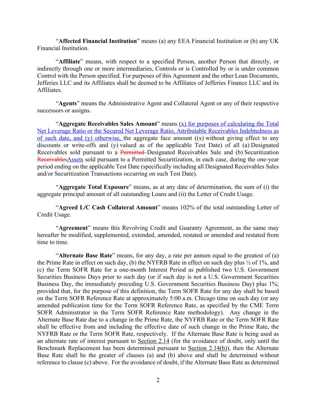 2 “Affected Financial Institution” means (a) any EEA Financial Institution or (b) any UK Financial Institution. “Affiliate” means, with respect to a specified Person, another Person that directly, or indirectly through one or more intermediaries, Controls or is Controlled by or is under common Control with the Person specified. For purposes of this Agreement and the other Loan Documents, Jefferies LLC and its Affiliates shall be deemed to be Affiliates of Jefferies Finance LLC and its Affiliates. “Agents” means the Administrative Agent and Collateral Agent or any of their respective successors or assigns. “Aggregate Receivables Sales Amount” means (x) for purposes of calculating the Total Net Leverage Ratio or the Secured Net Leverage Ratio, Attributable Receivables Indebtedness as of such date, and (y) otherwise, the aggregate face amount ((x) without giving effect to any discounts or write-offs and (y) valued as of the applicable Test Date) of all (a) Designated Receivables sold pursuant to a Permitted Designated Receivables Sale and (b) Securitization ReceivablesAssets sold pursuant to a Permitted Securitization, in each case, during the one-year period ending on the applicable Test Date (specifically including all Designated Receivables Sales and/or Securitization Transactions occurring on such Test Date). “Aggregate Total Exposure” means, as at any date of determination, the sum of (i) the aggregate principal amount of all outstanding Loans and (ii) the Letter of Credit Usage. “Agreed L/C Cash Collateral Amount” means 102% of the total outstanding Letter of Credit Usage. “Agreement” means this Revolving Credit and Guaranty Agreement, as the same may hereafter be modified, supplemented, extended, amended, restated or amended and restated from time to time. “Alternate Base Rate” means, for any day, a rate per annum equal to the greatest of (a) the Prime Rate in effect on such day, (b) the NYFRB Rate in effect on such day plus ½ of 1%, and (c) the Term SOFR Rate for a one-month Interest Period as published two U.S. Government Securities Business Days prior to such day (or if such day is not a U.S. Government Securities Business Day, the immediately preceding U.S. Government Securities Business Day) plus 1%; provided that, for the purpose of this definition, the Term SOFR Rate for any day shall be based on the Term SOFR Reference Rate at approximately 5:00 a.m. Chicago time on such day (or any amended publication time for the Term SOFR Reference Rate, as specified by the CME Term SOFR Administrator in the Term SOFR Reference Rate methodology). Any change in the Alternate Base Rate due to a change in the Prime Rate, the NYFRB Rate or the Term SOFR Rate shall be effective from and including the effective date of such change in the Prime Rate, the NYFRB Rate or the Term SOFR Rate, respectively. If the Alternate Base Rate is being used as an alternate rate of interest pursuant to Section 2.14 (for the avoidance of doubt, only until the Benchmark Replacement has been determined pursuant to Section 2.14(b)), then the Alternate Base Rate shall be the greater of clauses (a) and (b) above and shall be determined without reference to clause (c) above. For the avoidance of doubt, if the Alternate Base Rate as determined